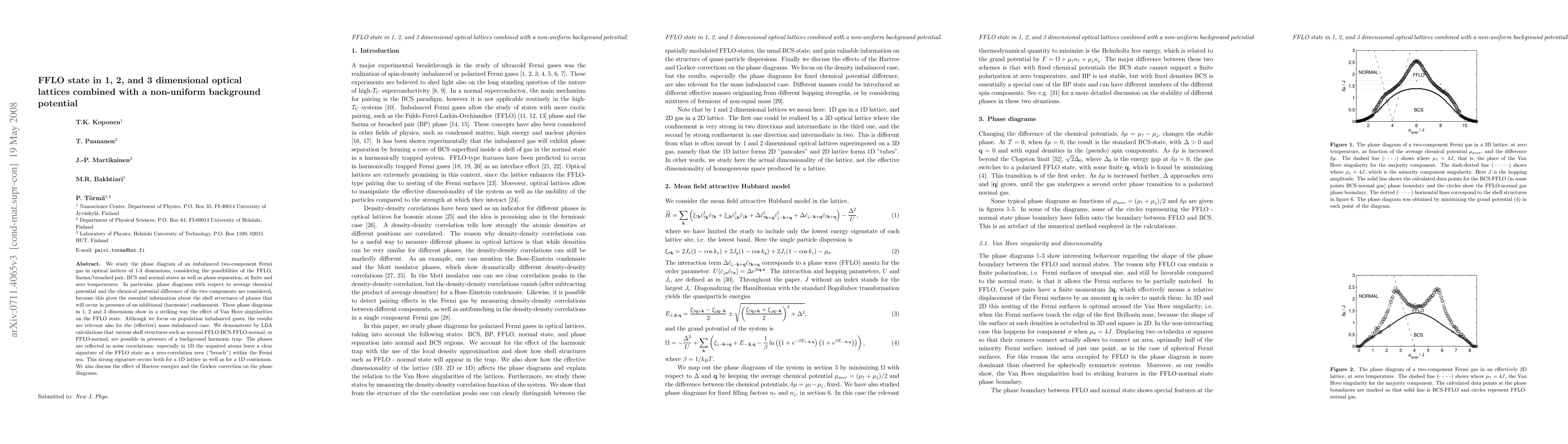 This paper investigates the phase diagram of an imbalanced Fermi gas in optical lattices across 1 to 3 dimensions, focusing on the Fulde-Ferrel-Larkin-Ovchinnikov (FFLO) state and its variations under non-uniform background potentials. The study reveals distinct phase structures influenced by Van Hove singularities and demonstrates the FFLO state's signature through noise correlations, particularly in 1D systems.