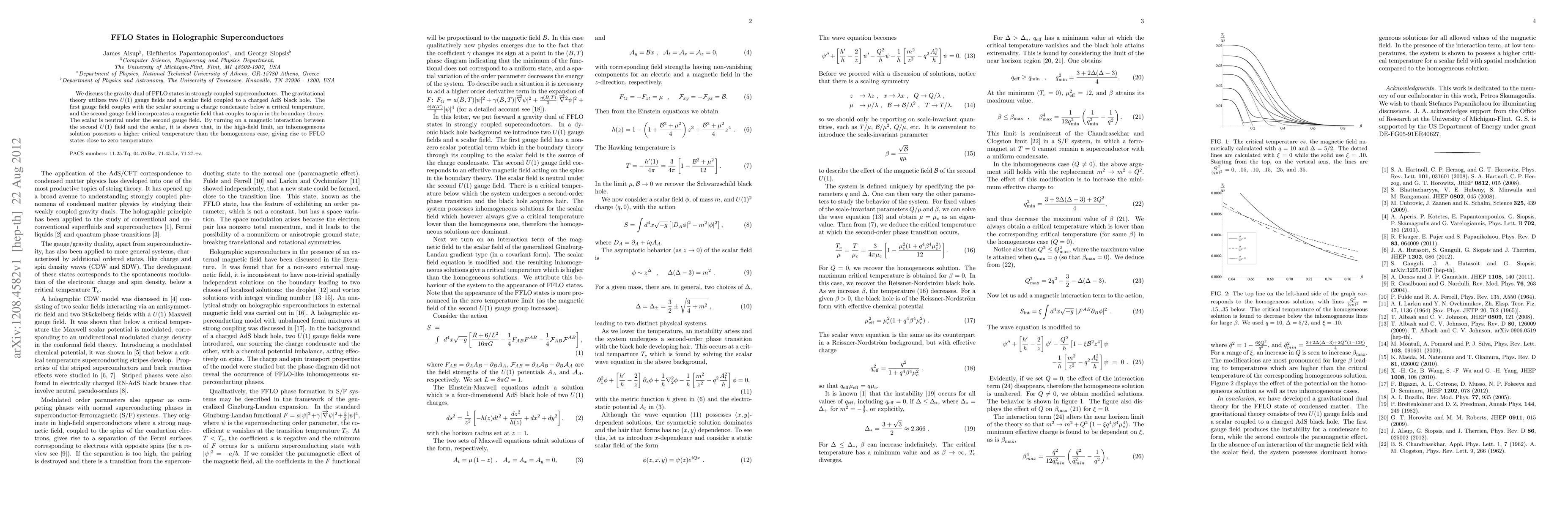 We discuss the gravity dual of FFLO states in strongly coupled superconductors. The gravitational theory utilizes two U(1) gauge fields and a scalar field coupled to a charged AdS black hole. The first gauge field couples with the scalar sourcing a charge condensate below a critical temperature, and the second gauge field incorporates a magnetic field that couples to spin in the boundary theory. The scalar is neutral under the second gauge field. By turning on a magnetic interaction between the second U(1) field and the scalar, it is shown that, in the high-field limit, an inhomogeneous solution possesses a higher critical temperature than the homogeneous case, giving rise to FFLO states close to zero temperature.