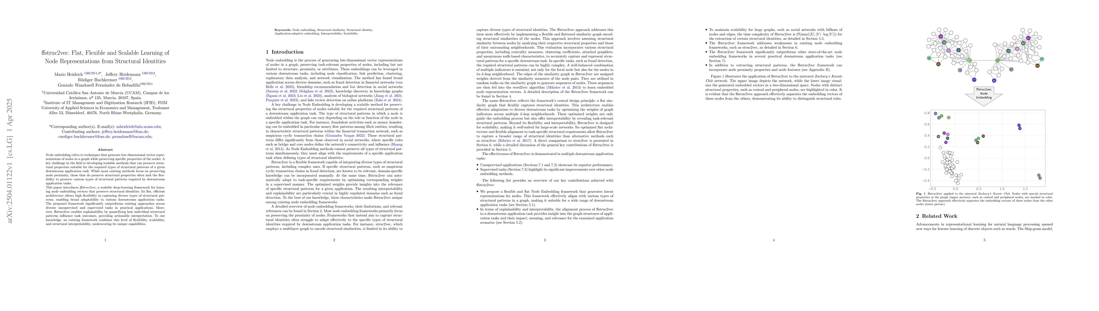 The paper introduces ffstruc2vec, a deep-learning framework for generating node embedding vectors that preserve structural identities in graphs, utilizing a flat and efficient architecture for flexibility in capturing diverse structural patterns.
