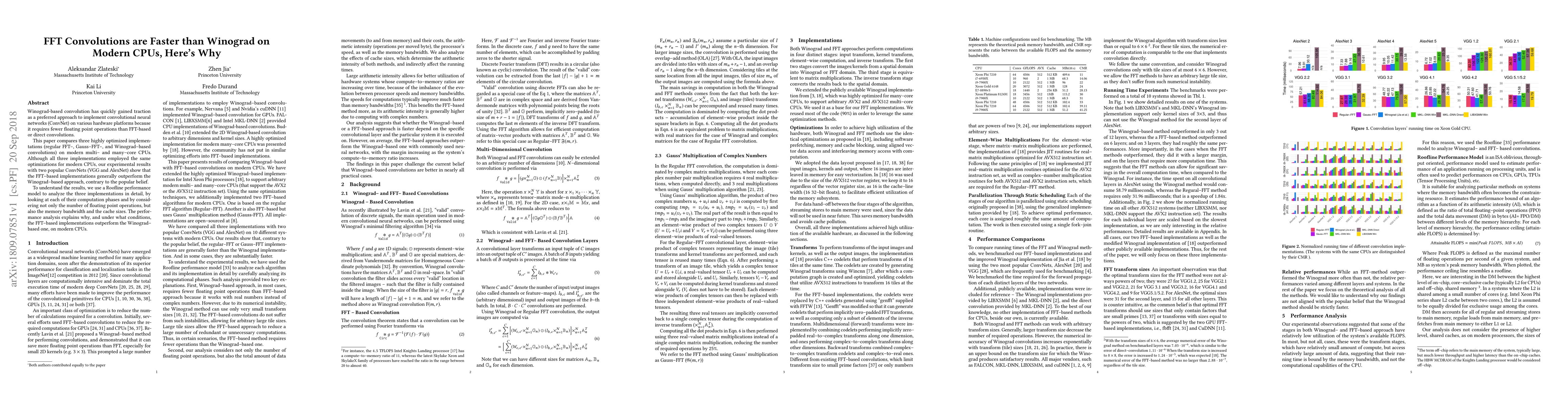 This paper demonstrates that FFT-based convolutions outperform Winograd-based convolutions on modern CPUs, despite Winograd's lower floating point operation count. Using a Roofline model, it explains the performance advantage by considering memory bandwidth and cache sizes, contrary to popular belief.