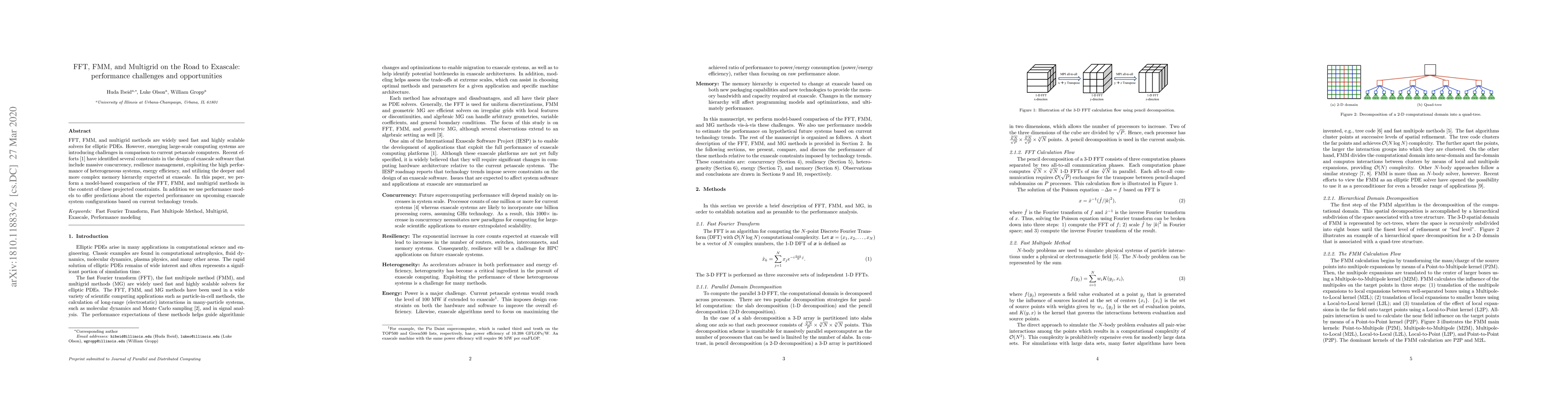 FFT, FMM, and multigrid methods are widely used fast and highly scalable solvers for elliptic PDEs. However, emerging large-scale computing systems are introducing challenges in comparison to current petascale computers. Recent efforts (Dongarra et al. 2011) have identified several constraints in the design of exascale software that includes massive concurrency, resilience management, exploiting the high performance of heterogeneous systems, energy efficiency, and utilizing the deeper and more complex memory hierarchy expected at exascale. In this paper, we perform a model-based comparison of the FFT, FMM, and multigrid methods in the context of these projected constraints. In addition, we use performance models to offer predictions about the expected performance on upcoming exascale system configurations based on current technology trends.