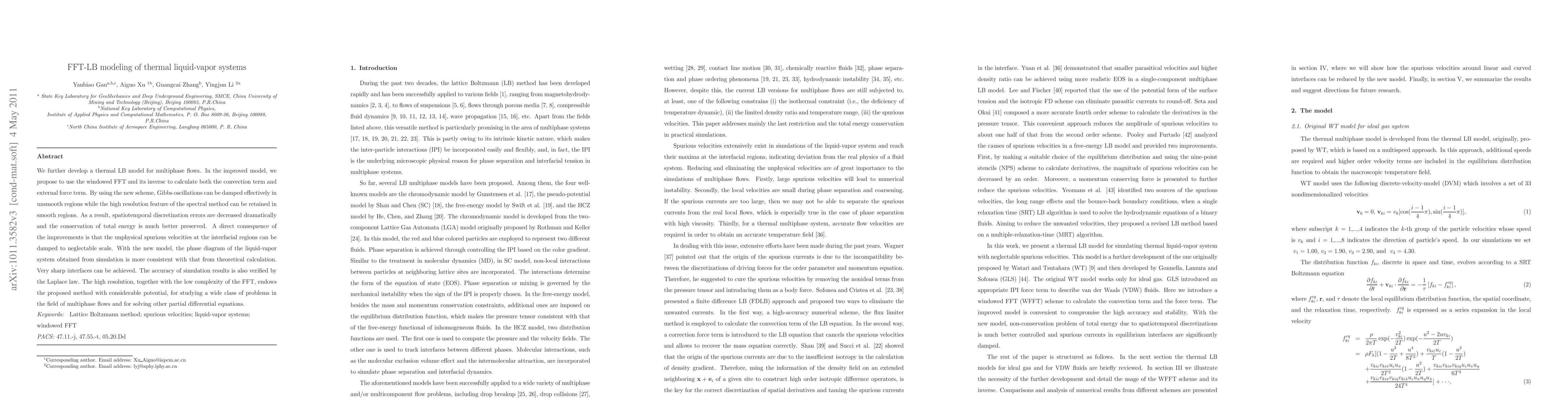 We further develop a thermal LB model for multiphase flows. In the improved model, we propose to use the FFT scheme to calculate both the convection term and external force term. The usage of FFT scheme is detailed and analyzed. By using the FFT algorithm spatiotemporal discretization errors are decreased dramatically and the conservation of total energy is much better preserved. A direct consequence of the improvement is that the unphysical spurious velocities at the interfacial regions can be damped to neglectable scale. Together with the better conservation of total energy, the more accurate flow velocities lead to the more accurate temperature field which determines the dynamical and final states of the system. With the new model, the phase diagram of the liquid-vapor system obtained from simulation is more consistent with that from theoretical calculation. Very sharp interfaces can be achieved. The accuracy of simulation results are also verified by the Laplace law. The FFT scheme can be easily applied to other models for multiphase flows.