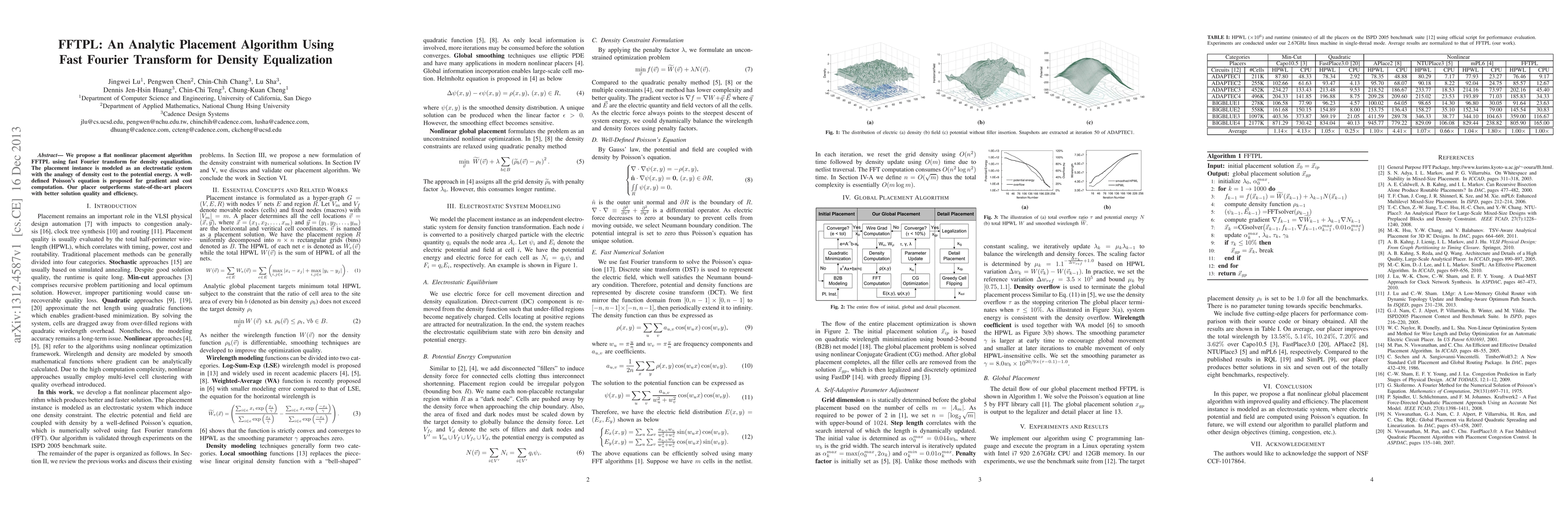 We propose a flat nonlinear placement algorithm FFTPL using fast Fourier transform for density equalization. The placement instance is modeled as an electrostatic system with the analogy of density cost to the potential energy. A well-defined Poisson's equation is proposed for gradient and cost computation. Our placer outperforms state-of-the-art placers with better solution quality and efficiency.