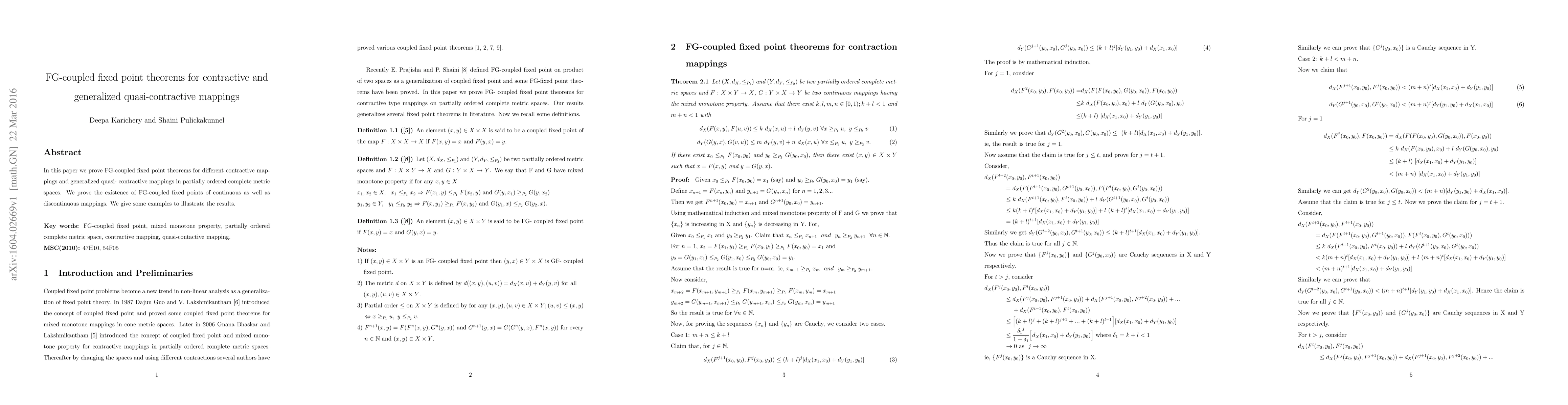 This paper proves FG-coupled fixed point theorems for both contractive and generalized quasi-contractive mappings in partially ordered complete metric spaces, demonstrating the existence of such points for both continuous and discontinuous mappings, with illustrative examples provided.