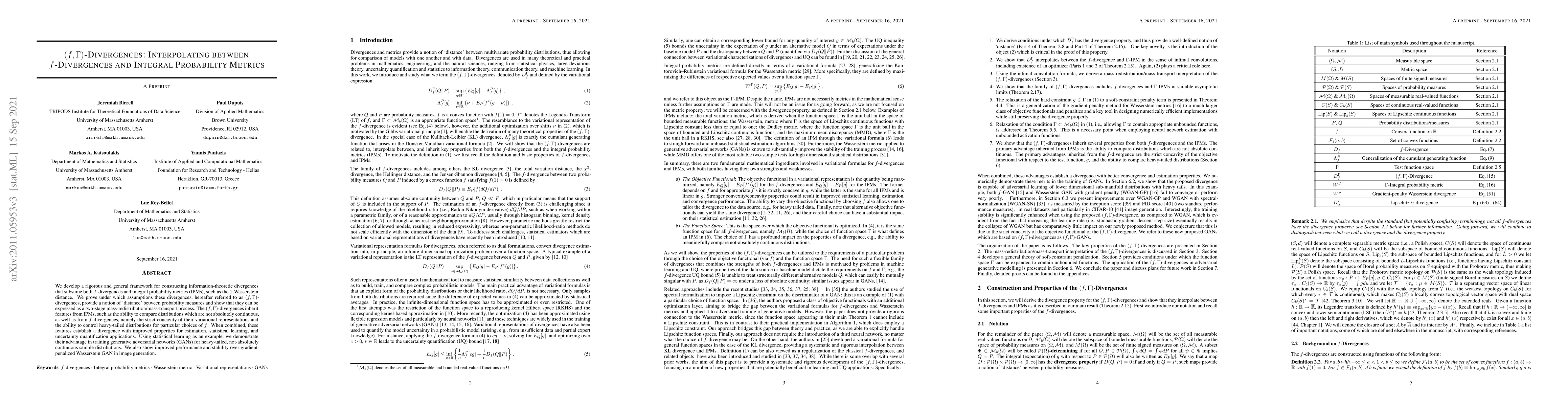 We develop a rigorous and general framework for constructing information-theoretic divergences that subsume both $f$-divergences and integral probability metrics (IPMs), such as the $1$-Wasserstein distance. We prove under which assumptions these divergences, hereafter referred to as $(f,\Gamma)$-divergences, provide a notion of `distance' between probability measures and show that they can be expressed as a two-stage mass-redistribution/mass-transport process. The $(f,\Gamma)$-divergences inherit features from IPMs, such as the ability to compare distributions which are not absolutely continuous, as well as from $f$-divergences, namely the strict concavity of their variational representations and the ability to control heavy-tailed distributions for particular choices of $f$. When combined, these features establish a divergence with improved properties for estimation, statistical learning, and uncertainty quantification applications. Using statistical learning as an example, we demonstrate their advantage in training generative adversarial networks (GANs) for heavy-tailed, not-absolutely continuous sample distributions. We also show improved performance and stability over gradient-penalized Wasserstein GAN in image generation.