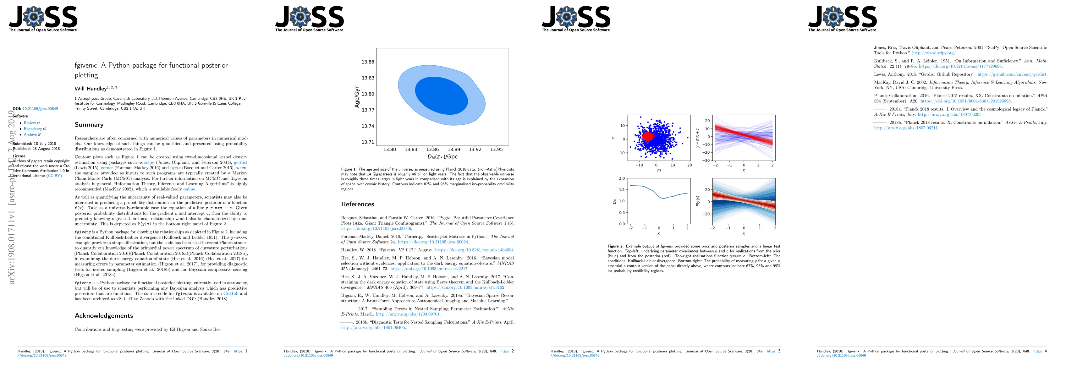 Two-line summary: fgivenx is a Python package designed for visualizing functional posteriors in Bayesian analysis, particularly useful in astronomy but applicable to any field requiring predictive posteriors represented as functions. The open-source code is available on GitHub for community use and contribution.
