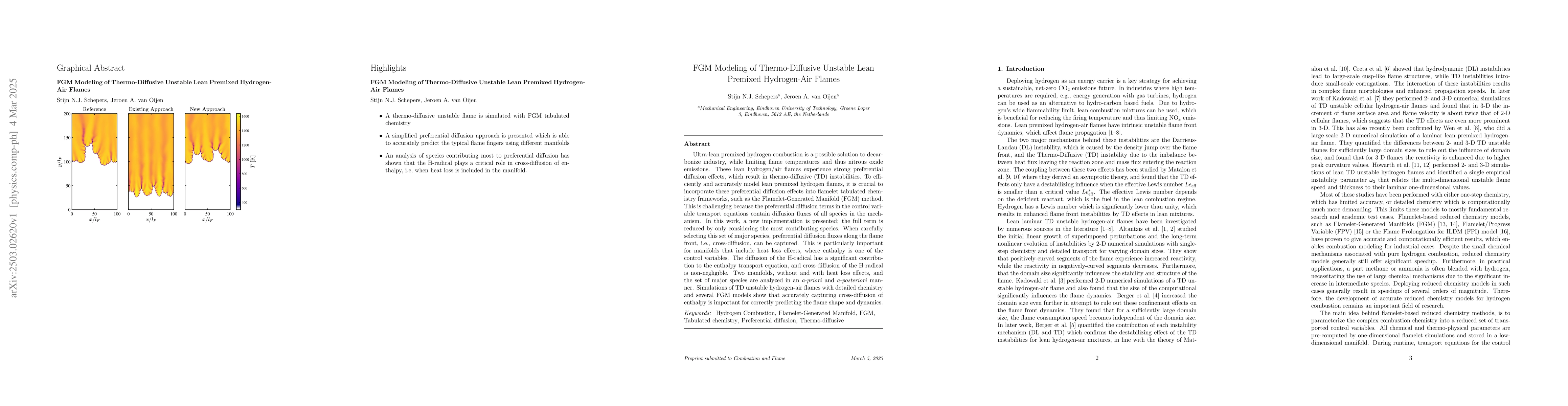 The research presents a new implementation for the Flamelet-Generated Manifold (FGM) method to model lean premixed hydrogen flames, reducing the complex preferential diffusion terms by considering only the most contributing species, particularly focusing on enthalpy transport equations.