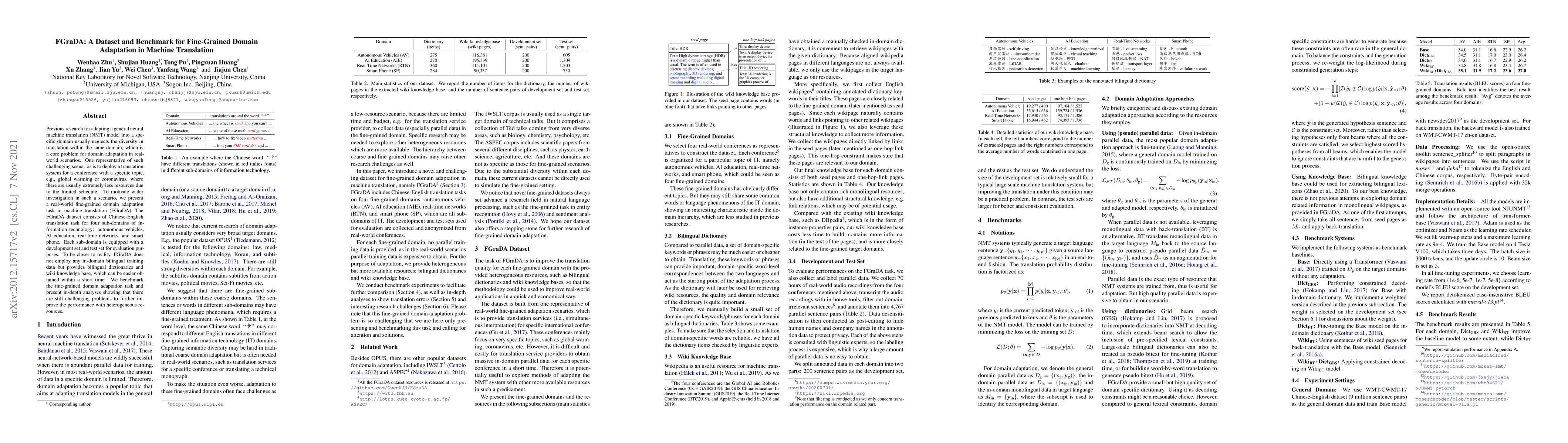 Previous research for adapting a general neural machine translation (NMT) model into a specific domain usually neglects the diversity in translation within the same domain, which is a core problem for domain adaptation in real-world scenarios. One representative of such challenging scenarios is to deploy a translation system for a conference with a specific topic, e.g., global warming or coronavirus, where there are usually extremely less resources due to the limited schedule. To motivate wider investigation in such a scenario, we present a real-world fine-grained domain adaptation task in machine translation (FGraDA). The FGraDA dataset consists of Chinese-English translation task for four sub-domains of information technology: autonomous vehicles, AI education, real-time networks, and smart phone. Each sub-domain is equipped with a development set and test set for evaluation purposes. To be closer to reality, FGraDA does not employ any in-domain bilingual training data but provides bilingual dictionaries and wiki knowledge base, which can be easier obtained within a short time. We benchmark the fine-grained domain adaptation task and present in-depth analyses showing that there are still challenging problems to further improve the performance with heterogeneous resources.