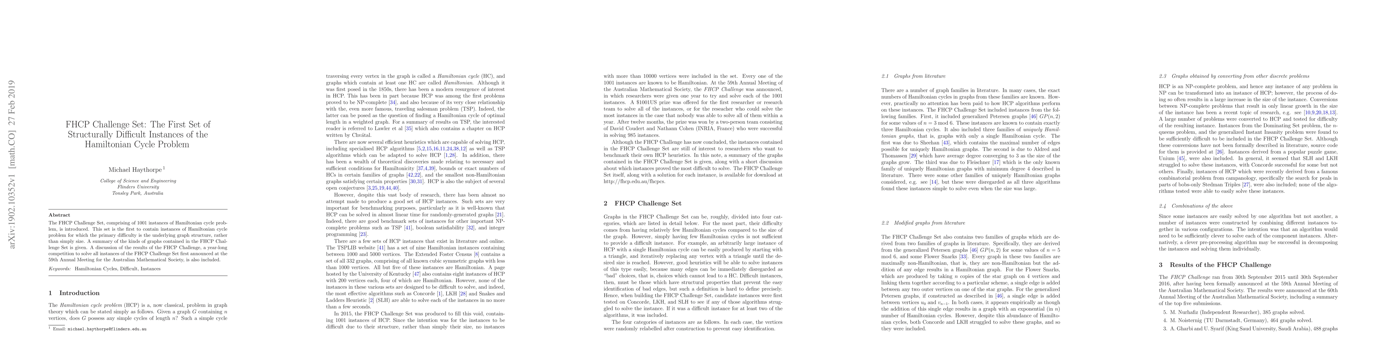 The FHCP Challenge Set introduces 1001 structurally difficult instances of the Hamiltonian cycle problem, focusing on graph structure rather than size. Results from a year-long competition to solve these instances are discussed, highlighting the unique challenges posed by the set.