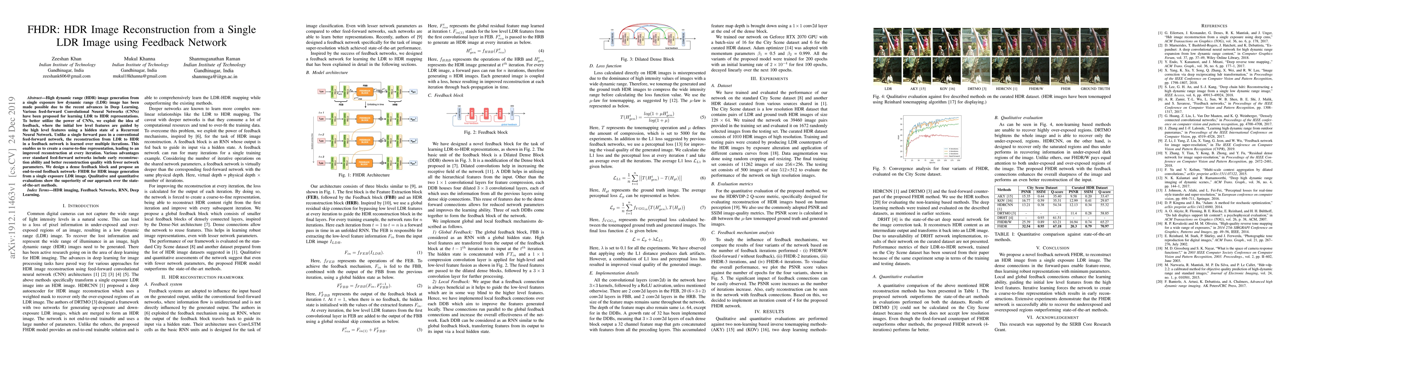 The FHDR network reconstructs high dynamic range (HDR) images from single low dynamic range (LDR) images using a feedback mechanism with a Recurrent Neural Network, achieving better reconstruction quality and efficiency compared to traditional feed-forward CNNs.