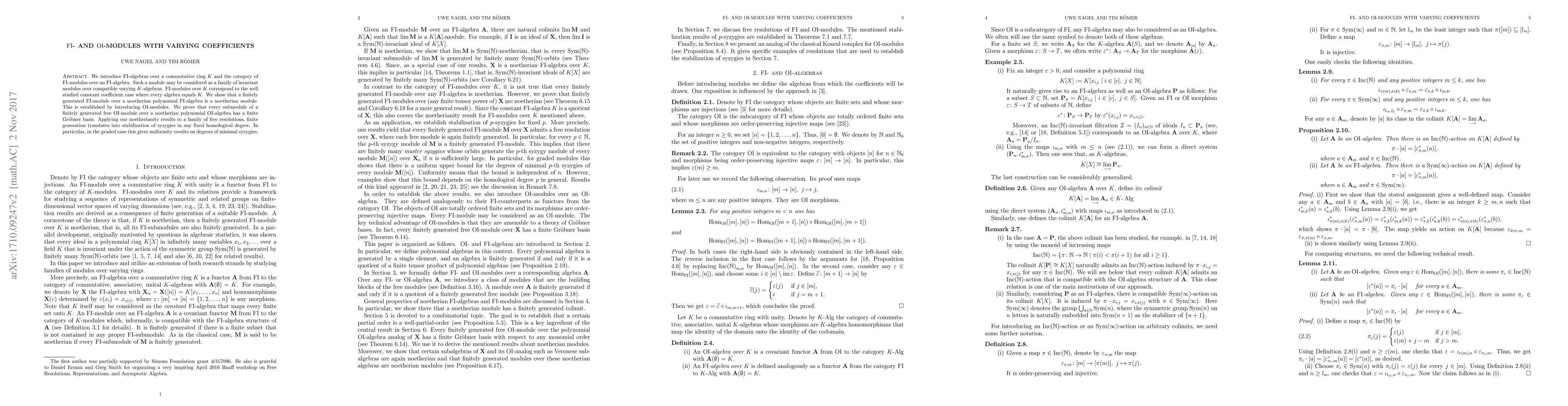 We introduce FI-algebras over a commutative ring $K$ and the category of FI-modules over an FI-algebra. Such a module may be considered as a family of invariant modules over compatible varying $K$-algebras. FI-modules over $K$ correspond to the well studied constant coefficient case where every algebra equals $K$. We show that a finitely generated FI-module over a noetherian polynomial FI-algebra is a noetherian module. This is established by introducing OI-modules. We prove that every submodule of a finitely generated free OI-module over a noetherian polynomial OI-algebra has a finite Gr\"obner basis. Applying our noetherianity results to a family of free resolutions, finite generation translates into stabilization of syzygies in any fixed homological degree. In particular, in the graded case this gives uniformity results on degrees of minimal syzygies.