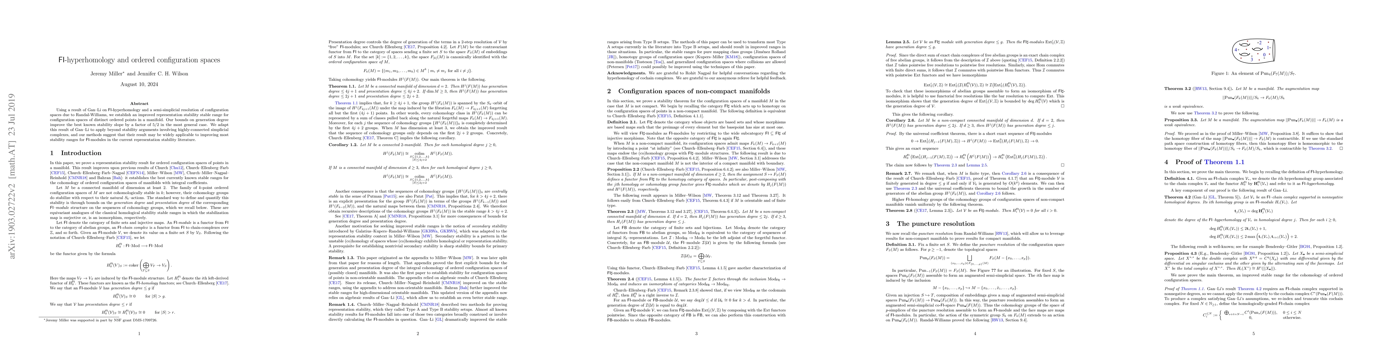 This paper leverages Gan and Li's FI-hyperhomology results and Randal-Williams' configuration space resolution to enhance representation stability for ordered configuration spaces, achieving a 5/2 improvement over the existing stability slope in general cases. The authors suggest broader applicability of these methods for improving stability ranges in FI-modules.