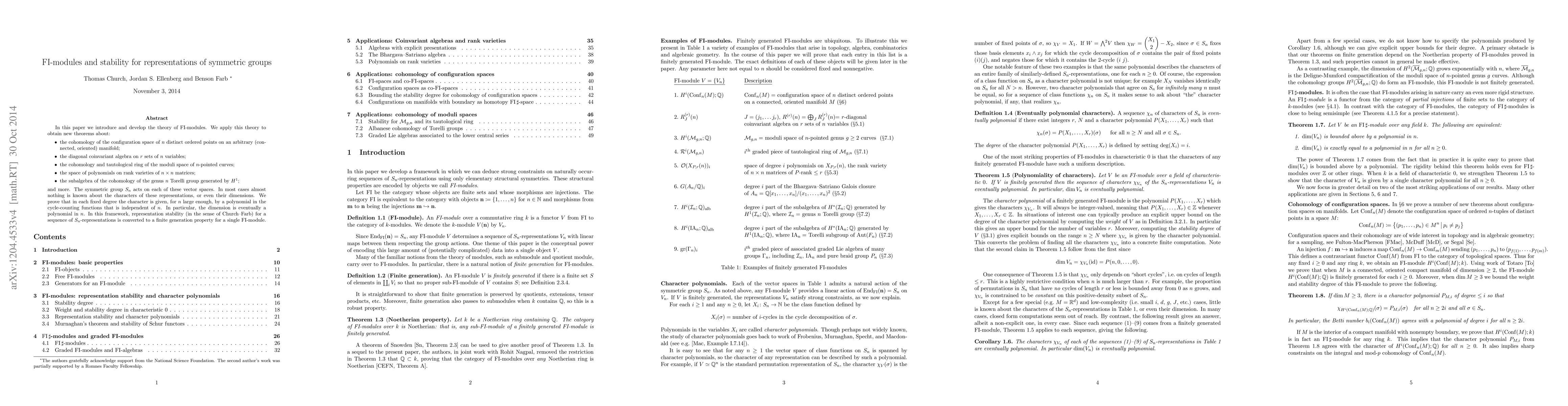 In this paper we introduce and develop the theory of FI-modules. We apply this theory to obtain new theorems about: - the cohomology of the configuration space of n distinct ordered points on an arbitrary (connected, oriented) manifold - the diagonal coinvariant algebra on r sets of n variables - the cohomology and tautological ring of the moduli space of n-pointed curves - the space of polynomials on rank varieties of n x n matrices - the subalgebra of the cohomology of the genus n Torelli group generated by H^1 and more. The symmetric group S_n acts on each of these vector spaces. In most cases almost nothing is known about the characters of these representations, or even their dimensions. We prove that in each fixed degree the character is given, for n large enough, by a polynomial in the cycle-counting functions that is independent of n. In particular, the dimension is eventually a polynomial in n. In this framework, representation stability (in the sense of Church-Farb) for a sequence of S_n-representations is converted to a finite generation property for a single FI-module.