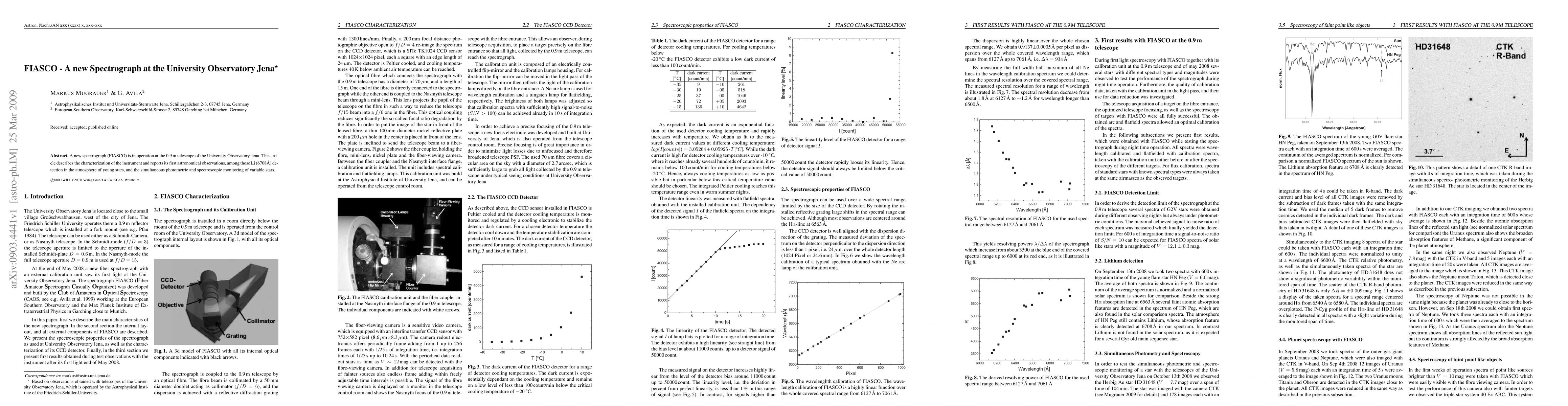 FIASCO, a new spectrograph at the University Observatory Jena, has been characterized and utilized for initial astronomical observations, including the detection of lithium in young stars and the monitoring of variable stars through simultaneous photometry and spectroscopy.