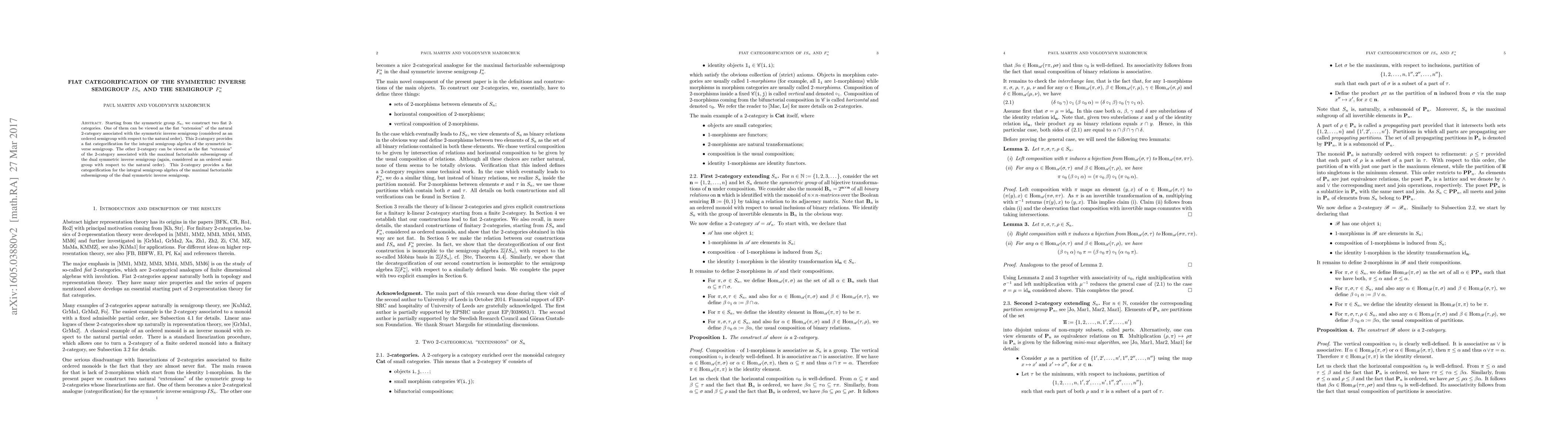 Starting from the symmetric group $S_n$, we construct two fiat $2$-categories. One of them can be viewed as the fiat "extension" of the natural $2$-category associated with the symmetric inverse semigroup (considered as an ordered semigroup with respect to the natural order). This $2$-category provides a fiat categorification for the integral semigroup algebra of the symmetric inverse semigroup. The other $2$-category can be viewed as the fiat "extension" of the $2$-category associated with the maximal factorizable subsemigroup of the dual symmetric inverse semigroup (again, considered as an ordered semigroup with respect to the natural order). This $2$-category provides a fiat categorification for the integral semigroup algebra of the maximal factorizable subsemigroup of the dual symmetric inverse semigroup.