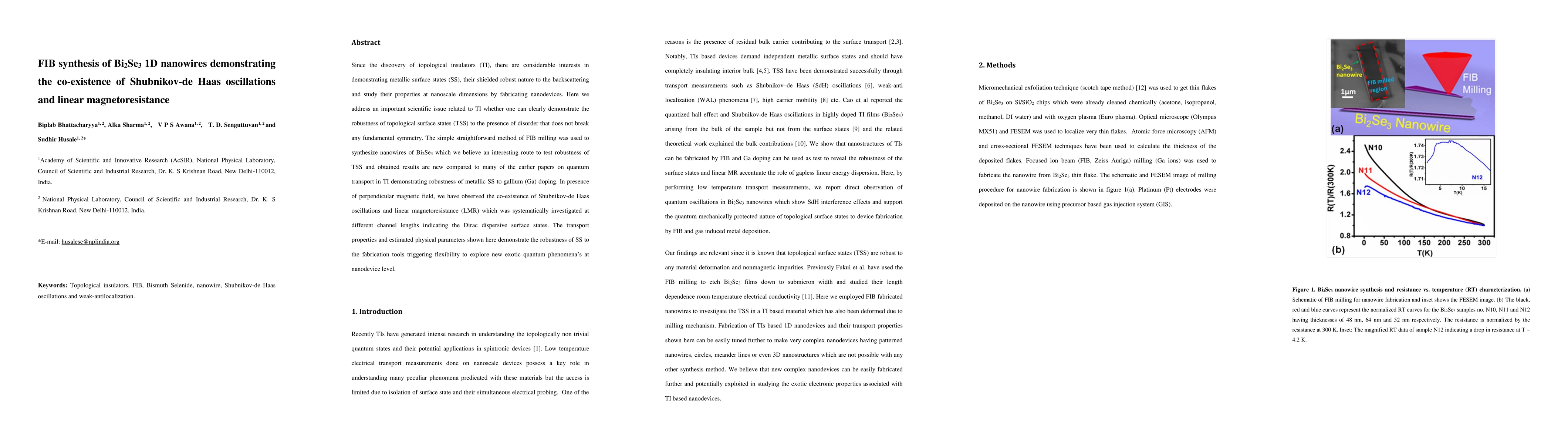 This paper reports on the synthesis of Bi2Se3 one-dimensional nanowires using focused ion beam (FIB) milling, revealing the coexistence of Shubnikov-de Haas oscillations and linear magnetoresistance, indicating the robustness of topological surface states against disorder. The findings suggest flexibility in exploring quantum phenomena at nanoscale devices.