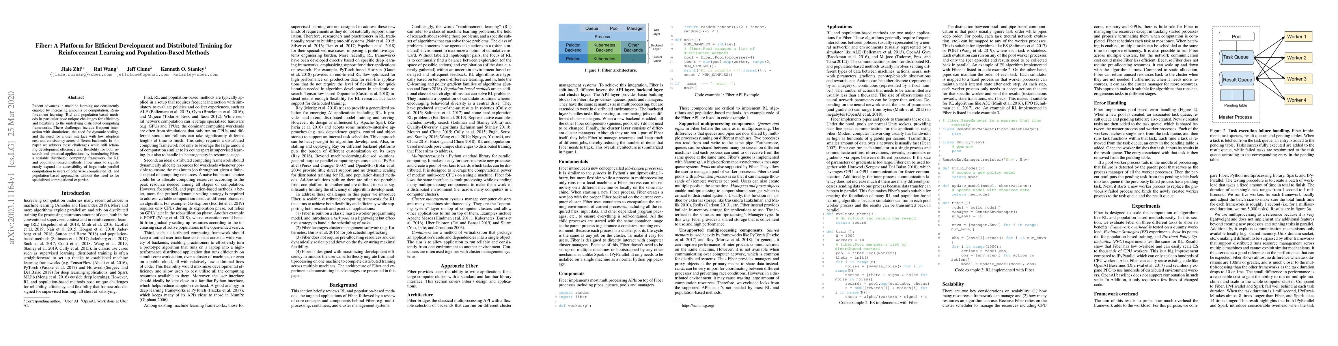 Fiber is a platform that enables efficient development and distributed training for reinforcement learning and population-based methods, addressing challenges such as scalability and user adoption.