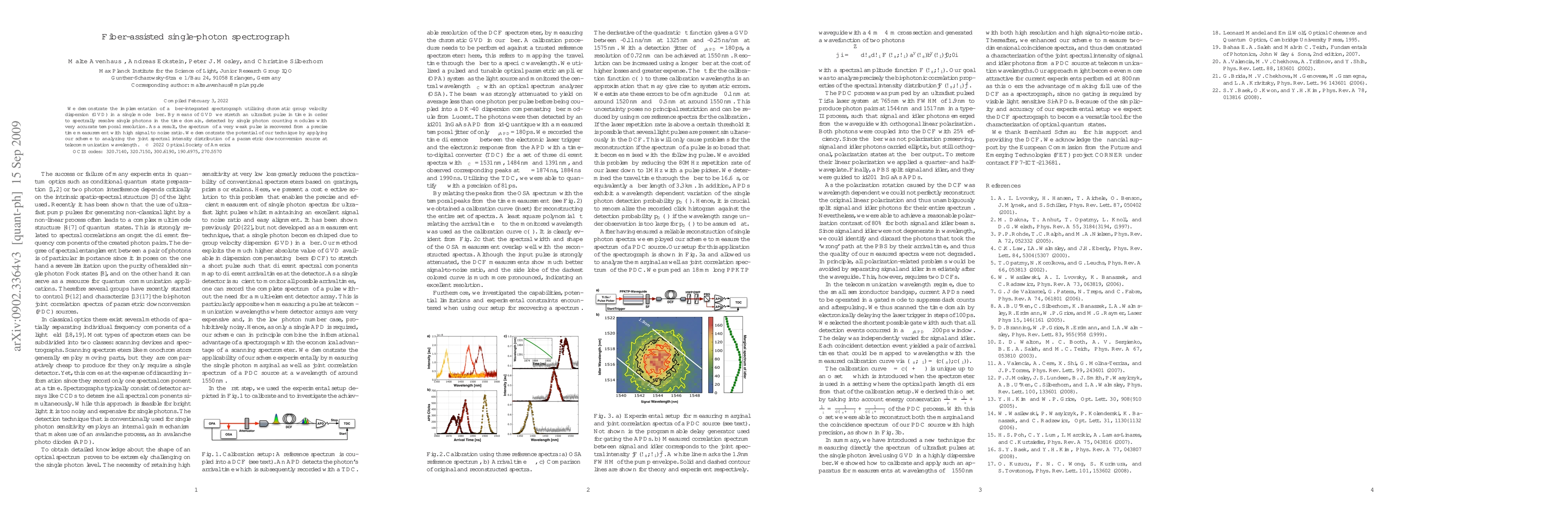 This paper presents a fiber-integrated spectrograph that uses chromatic group velocity dispersion to stretch ultrafast pulses, enabling precise spectral resolution of single photons in the time domain. The technique is demonstrated by analyzing the joint spectral intensity distribution of a parametric downconversion source at telecommunication wavelengths.