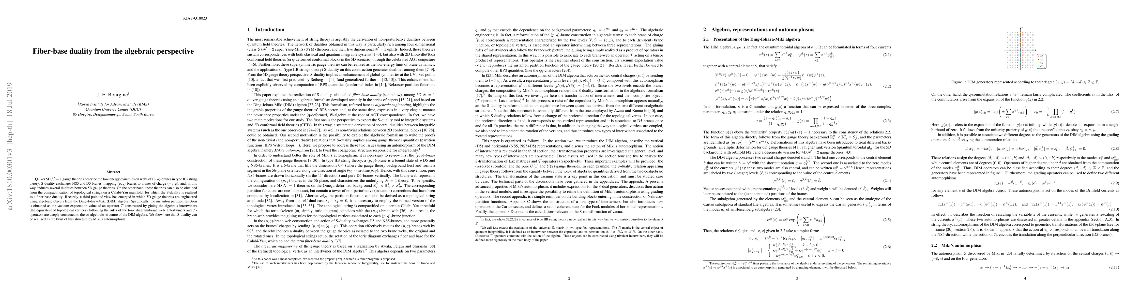 This paper explores the algebraic underpinnings of fiber-base duality in 5D $\mathcal{N}=1$ gauge theories, linking S-duality to the DIM algebra's co-algebraic structure via Miki's automorphism, and demonstrating how instanton partition functions emerge from algebraic intertwining operations.