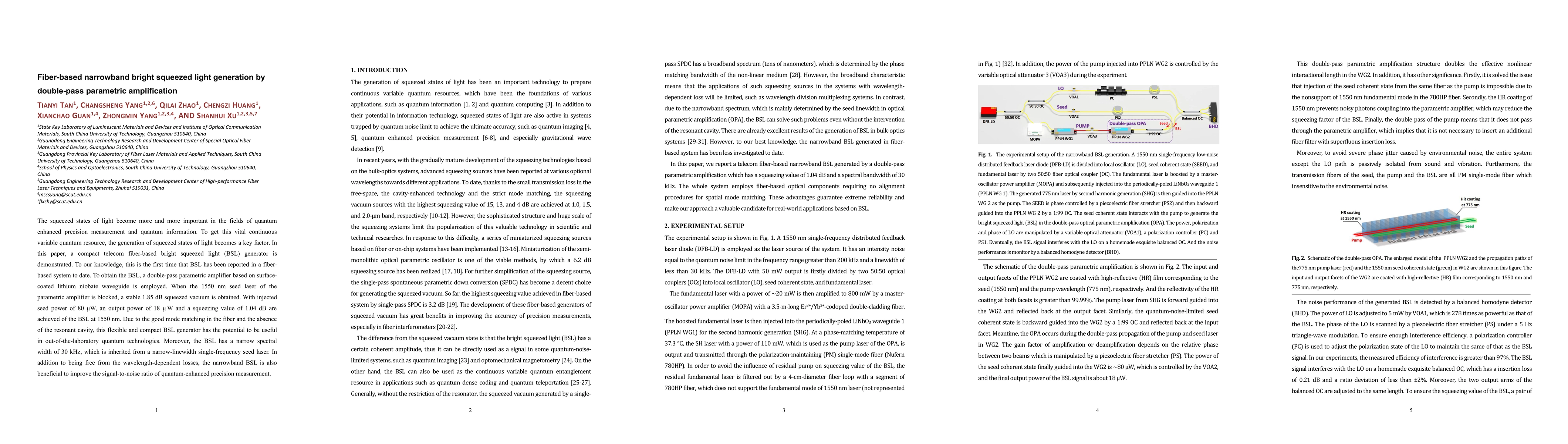 This paper demonstrates a compact fiber-based system for generating bright squeezed light (BSL) using double-pass parametric amplification on a lithium niobate waveguide. The system achieves 1.85 dB of vacuum squeezing and 1.04 dB of BSL squeezing at 1550 nm, with a narrow spectral width of 30 kHz, making it suitable for quantum technologies and enhancing precision measurement.