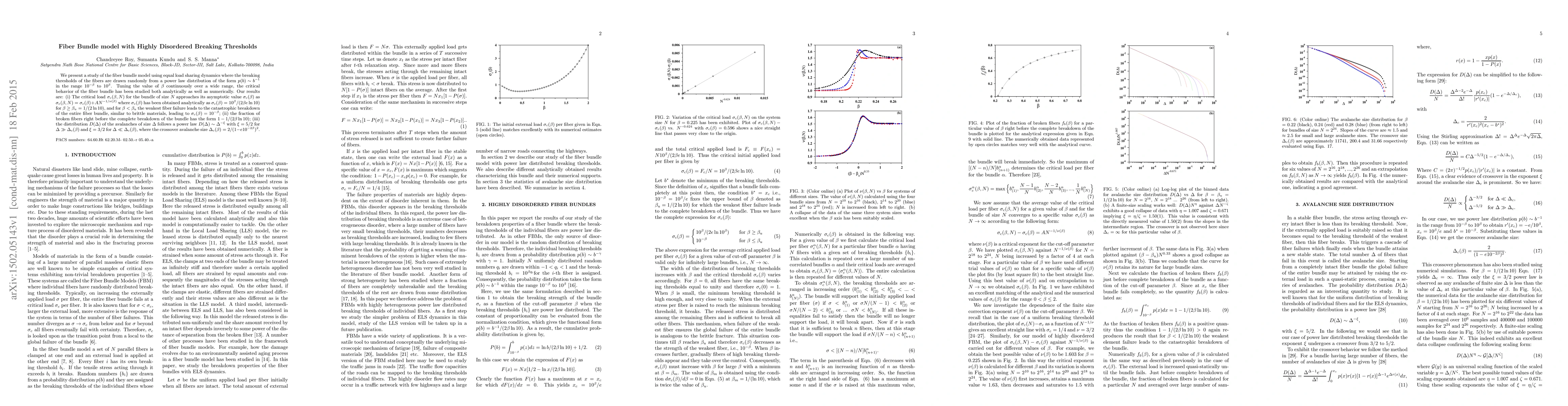 This research explores the fiber bundle model under equal load sharing dynamics with fiber breaking thresholds drawn from a power law distribution. The study reveals critical behaviors: the critical load approaches an asymptotic value, weakest fiber failure causes catastrophic breakdown for low parameters, and avalanche sizes follow a power law distribution with crossover characteristics.
