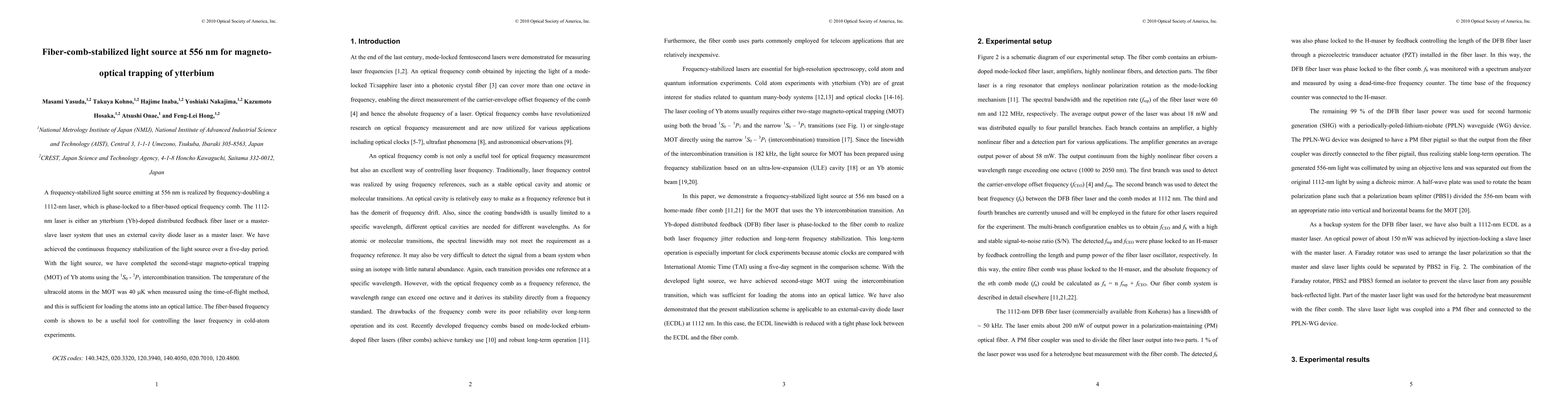 This research develops a fiber-comb-stabilized light source at 556 nm, realized by frequency-doubling a phase-locked 1112-nm laser, for magneto-optical trapping of ytterbium atoms, achieving continuous frequency stabilization and successful second-stage MOT at 40 µK.