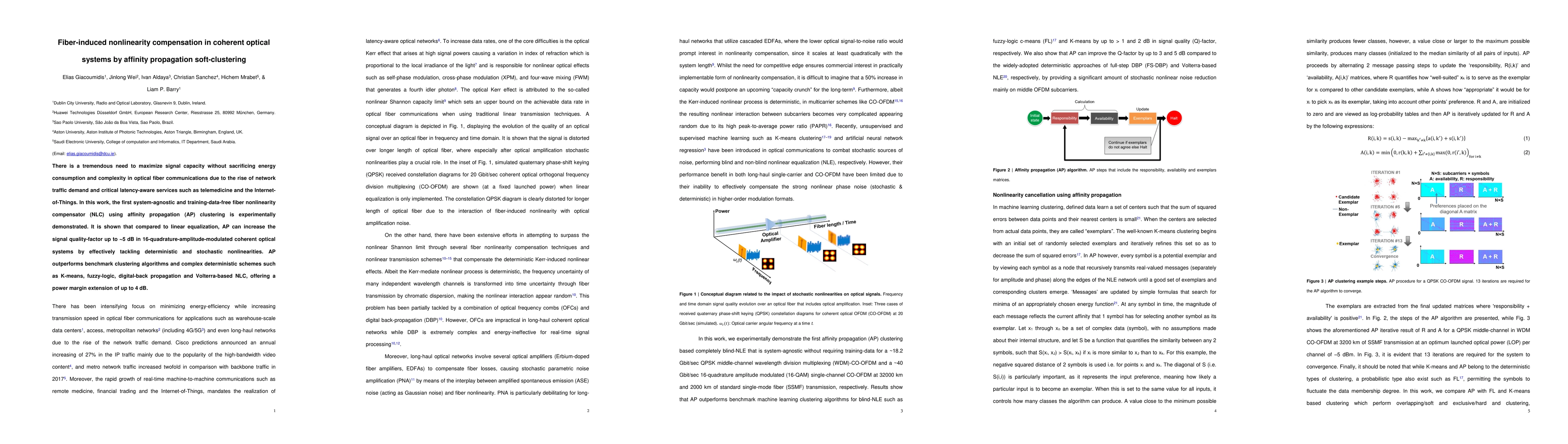 This paper presents a novel fiber nonlinearity compensator using affinity propagation clustering for coherent optical systems, achieving up to 5 dB improvement in signal quality compared to linear equalization, and outperforming other clustering and deterministic methods. The proposed system is system-agnostic, training-data-free, and offers a power margin extension of up to 4 dB.