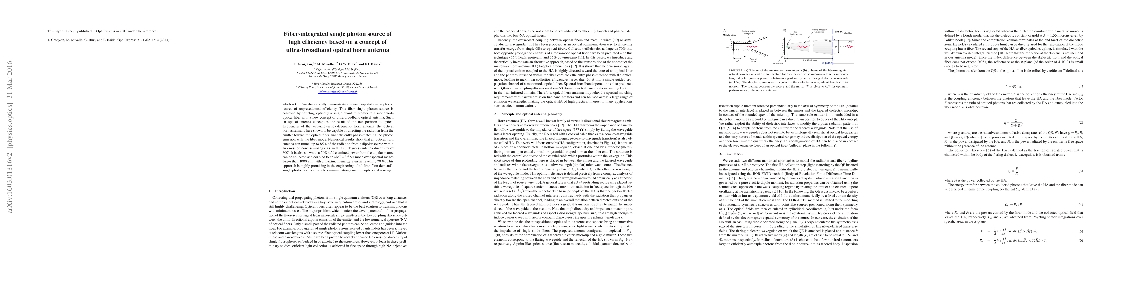We theoretically demonstrate a fiber-integrated single photon source of unprecedented efficiency. This fiber single photon source is achieved by coupling optically a single quantum emitter to a monomode optical fiber with a new concept of ultra-broadband optical antenna. Such an optical antenna concept is the result of the transposition to optical frequencies of the well-known low-frequency horn antenna The optical horn antenna is here shown to be capable of directing the radiation from the emitter toward the optical fiber and efficiently phase-matching the photon emission with the fiber mode. Numerical results show that an optical horn antenna can funnel up to 85% of the radiation from a dipolar source within an emission cone semi-angle as small as 7 degrees (antenna directivity of 300). It is also shown that 50% of the emitted power from the dipolar source can be collected and coupled to an SMF-28 fiber mode over spectral ranges larger than 1000 nm, with a maximum energy transfer reaching 70 %. This approach is highly promising in the engineering of all-fiber "on-demand" single photon sources for telecommunication, quantum optics and sensing.