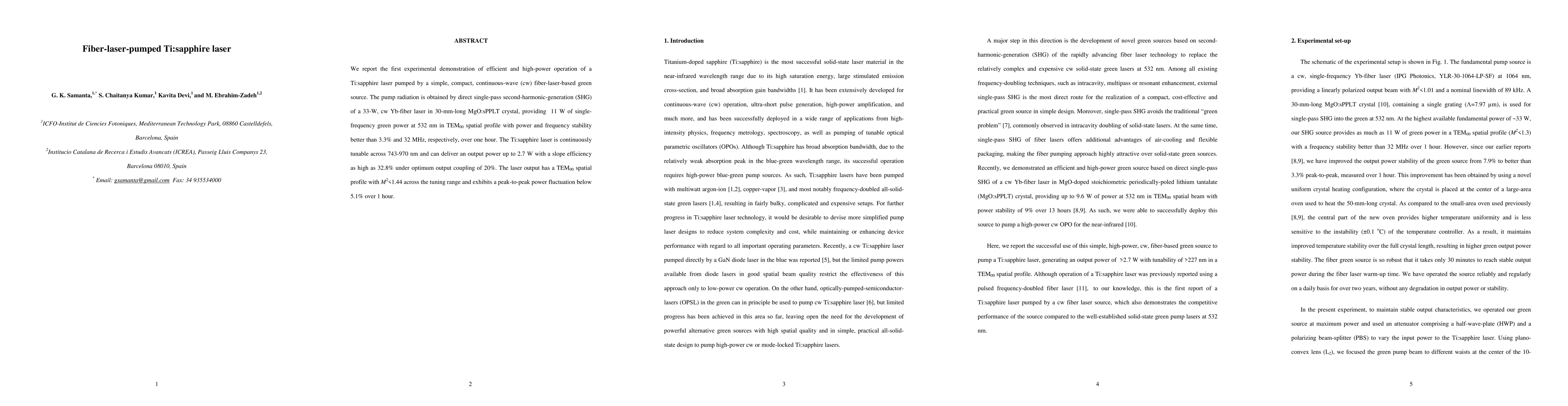 This paper demonstrates a high-power, fiber-laser-pumped Ti:sapphire laser that efficiently operates using a green pump source derived from a continuous-wave Yb-fiber laser through second-harmonic generation, achieving up to 2.7 W of tunable output with high stability and spatial purity.