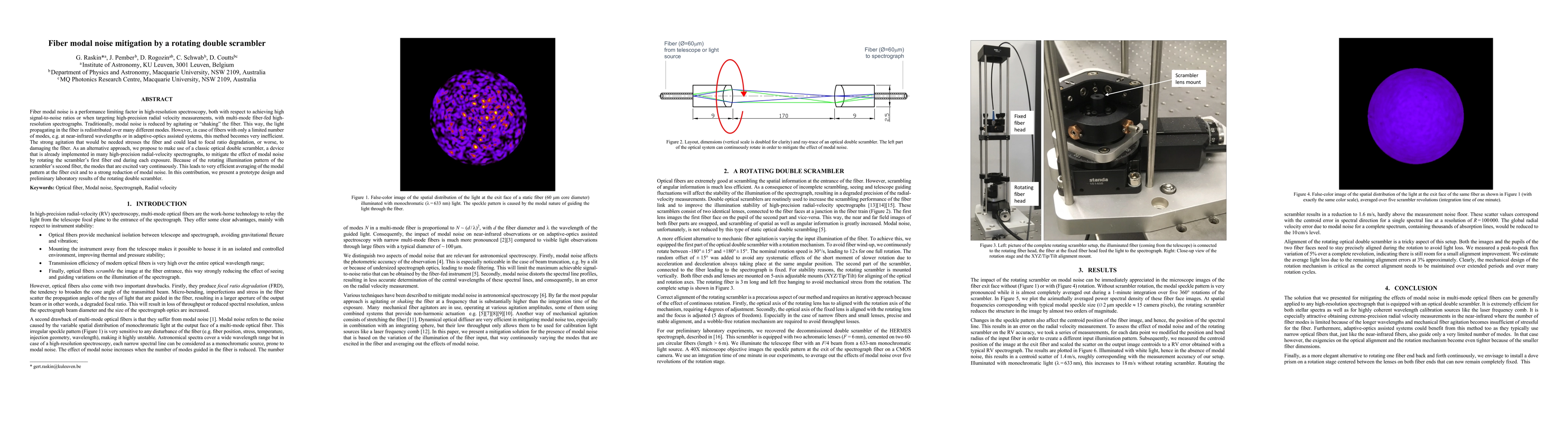This paper proposes a rotating double scrambler to mitigate fiber modal noise in high-resolution spectroscopy, offering an efficient alternative to traditional agitation methods that can stress the fiber. Preliminary results show significant reduction in modal noise through continuous variation of the excited modes.