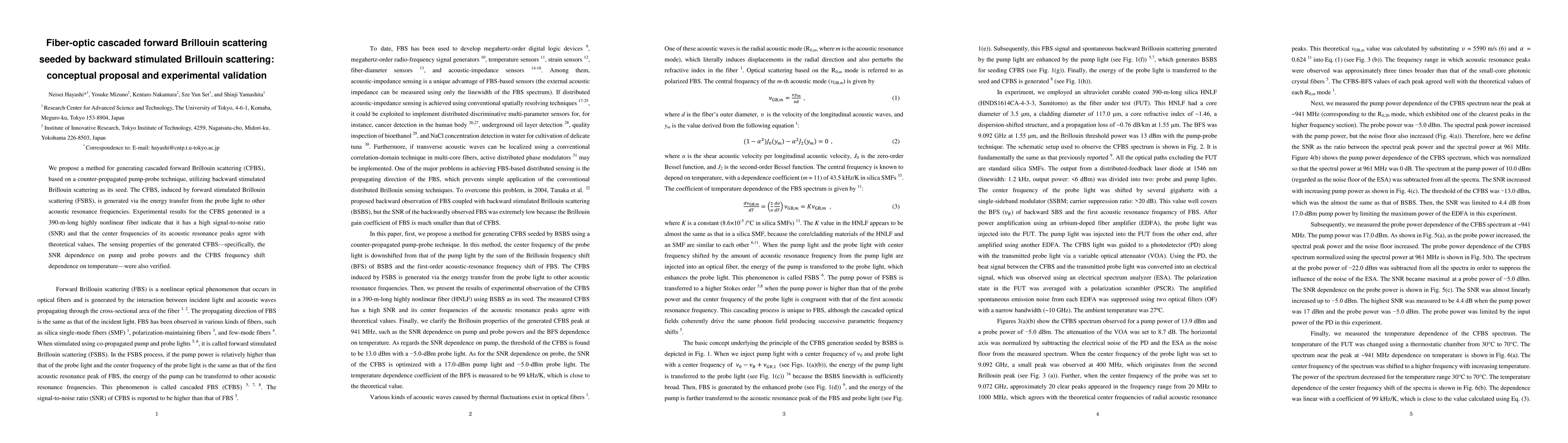 This research proposes a method for generating cascaded forward Brillouin scattering using backward stimulated Brillouin scattering as a seed, validated experimentally in a 390-m-long highly nonlinear fiber, showing high signal-to-noise ratio and agreement with theoretical center frequencies. Sensing properties of the generated cascaded forward Brillouin scattering were confirmed.