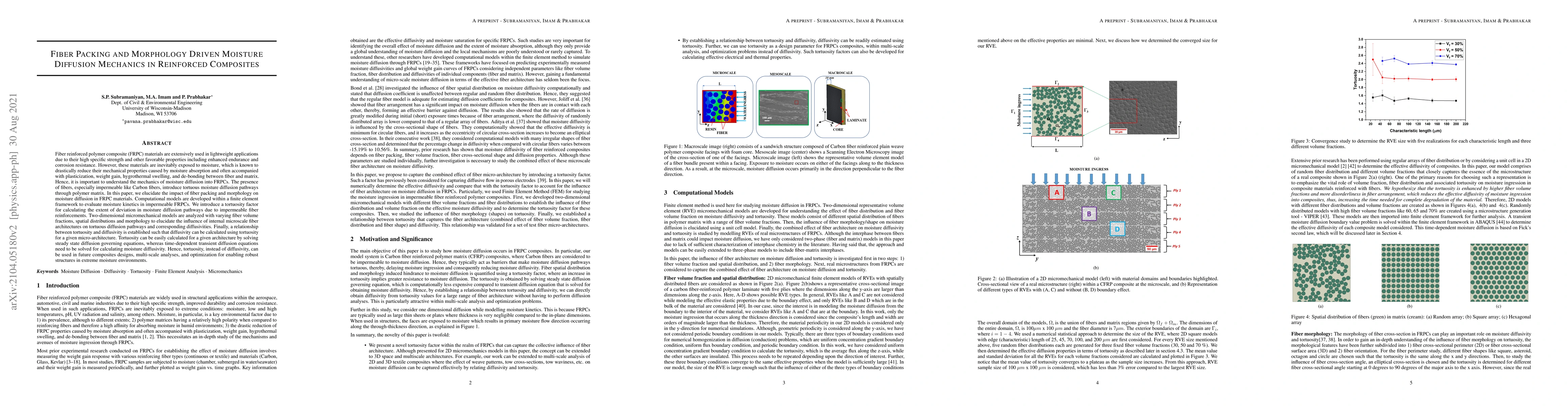 This paper investigates the impact of fiber packing and morphology on moisture diffusion in fiber reinforced polymer composites (FRPCs), developing computational models to evaluate moisture kinetics. It introduces a tortuosity factor to measure the deviation in moisture diffusion pathways due to impermeable fibers, establishing a relationship between tortuosity and diffusivity for predicting moisture behavior in FRPCs, which can aid in future composite designs and optimizations.