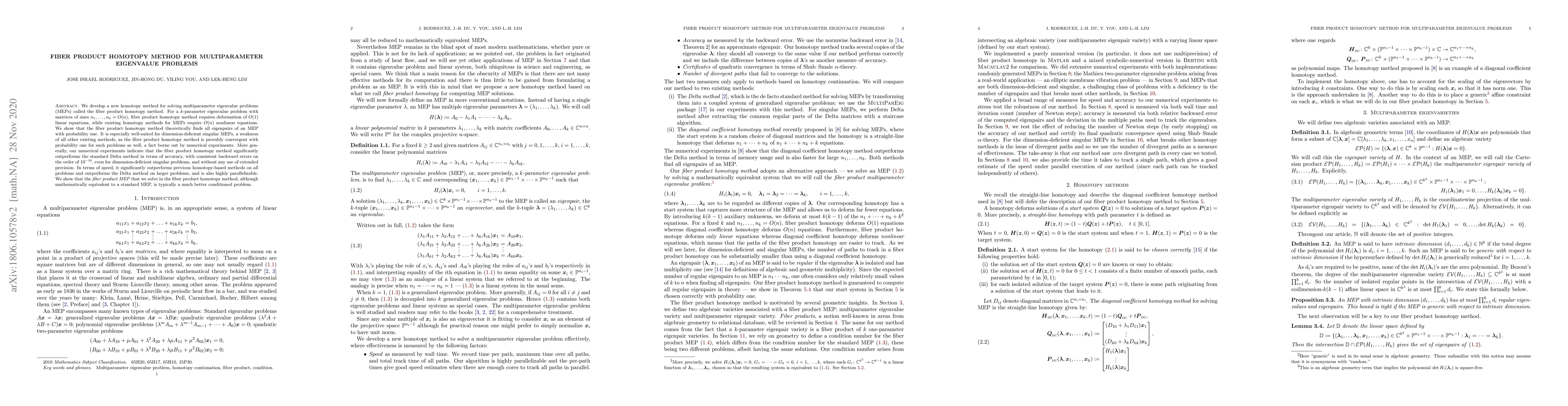 The paper introduces a novel fiber product homotopy method for solving multiparameter eigenvalue problems (MEPs), which requires deformation of $O(1)$ linear equations compared to $O(n)$ nonlinear equations in existing methods. This new approach is shown to find all eigenpairs with high probability and is particularly effective for solving dimension-deficient singular MEPs, outperforming the Delta method in accuracy and speed, and offering better conditioning.
