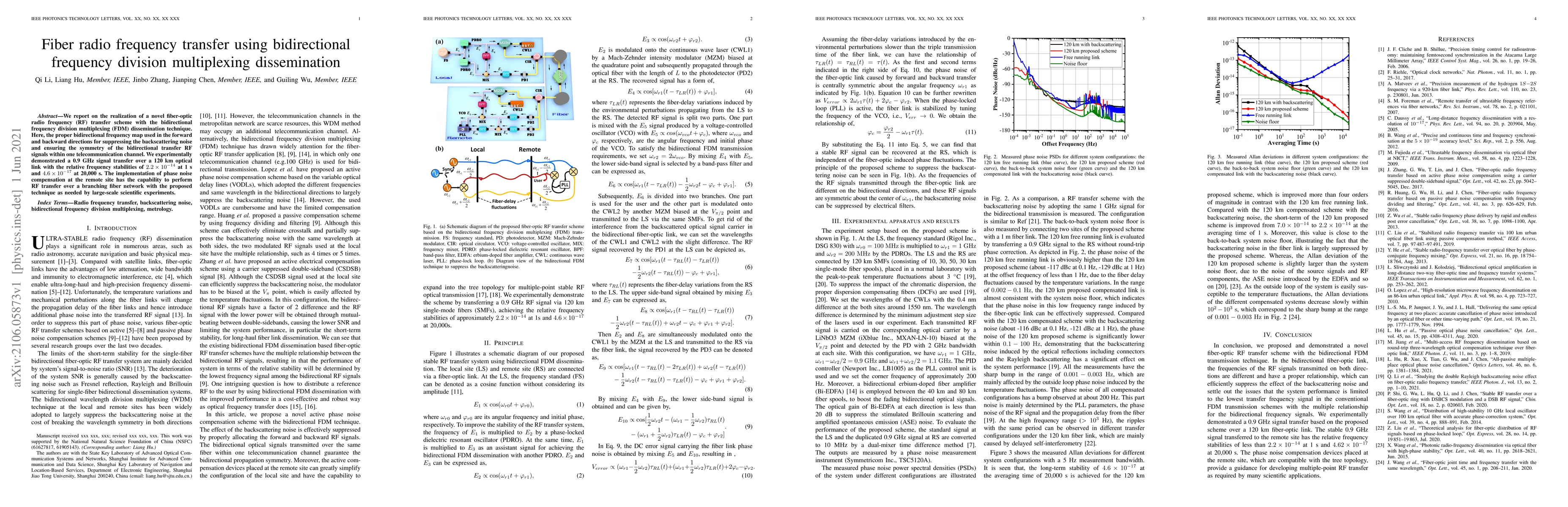 This paper presents a novel fiber-optic radio frequency transfer scheme using bidirectional frequency division multiplexing, achieving a 0.9 GHz signal over a 120 km link with high frequency stability. The method includes phase noise compensation and can support RF transfer in a branching fiber network.