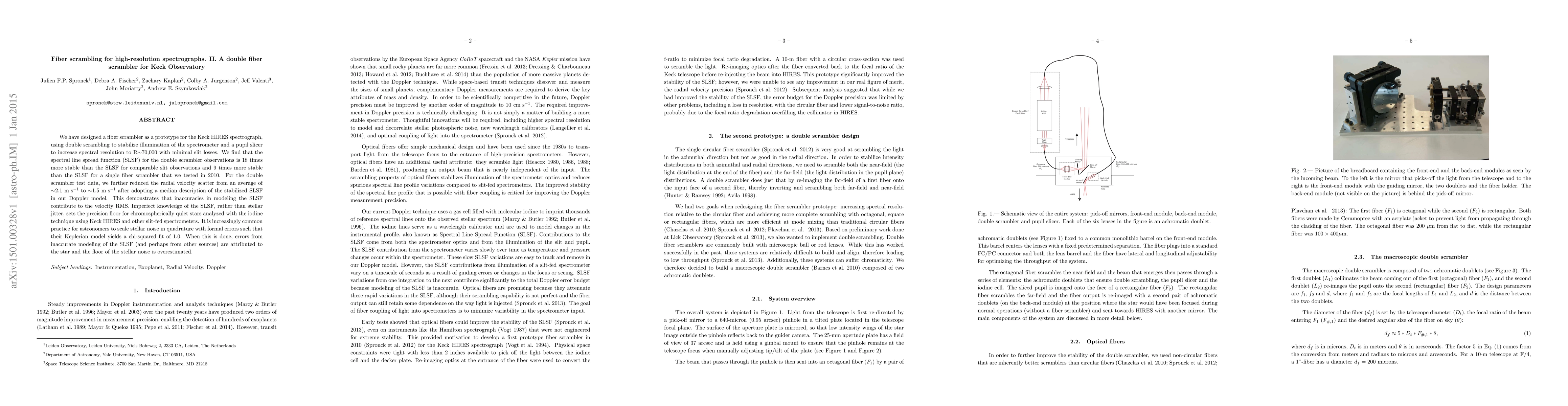 This paper presents a double fiber scrambler prototype for the Keck HIRES spectrograph, achieving a spectral resolution of R = 70,000 with reduced slit losses. The double scrambler stabilizes the spectral line spread function (SLSF) 18 times more than comparable slit observations, improving radial velocity precision from 2.1 m/s to 1.5 m/s.