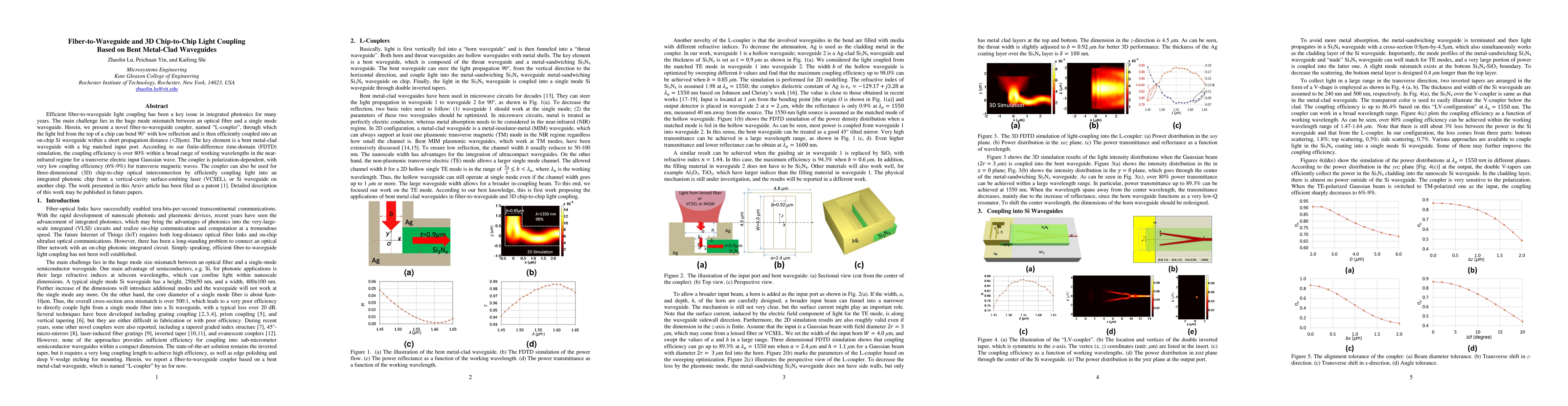 This paper introduces a novel "L-coupler" for efficient fiber-to-waveguide light coupling using a bent metal-clad waveguide, achieving over 80% coupling efficiency in the near-infrared regime. The coupler also enables 3D chip-to-chip optical interconnections with low reflection and short propagation distances.