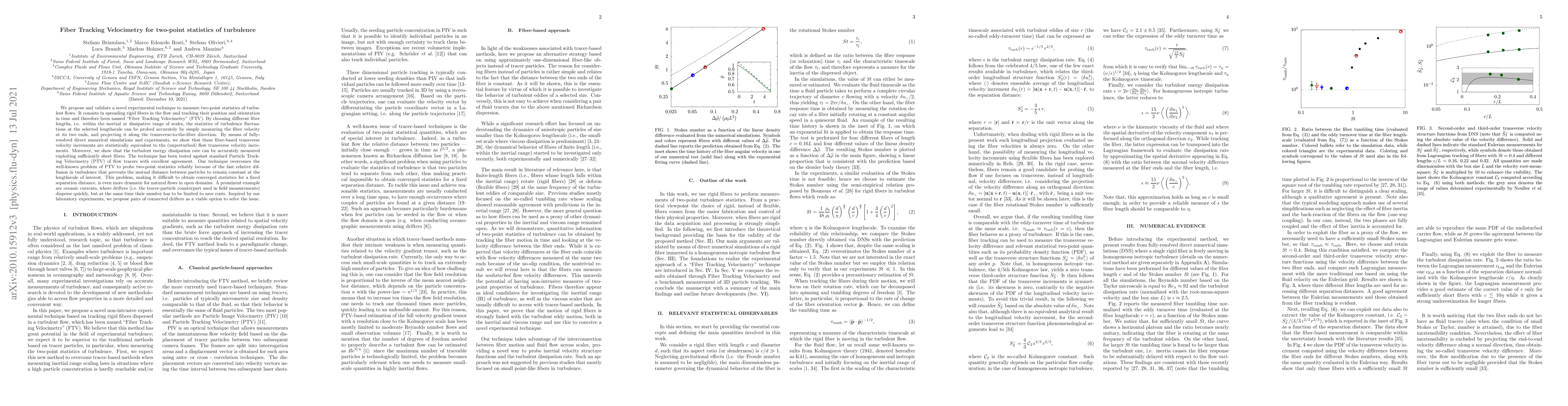We propose and validate a novel experimental technique to measure two-point statistics of turbulent flows. It consists in spreading rigid fibers in the flow and tracking their position and orientation in time and therefore been named ``Fiber Tracking Velocimetry'' (FTV). By choosing different fiber lengths, i.e. within the inertial or dissipative range of scales, the statistics of turbulence fluctuations at the selected lengthscale can be probed accurately by simply measuring the fiber velocity at its two ends, and projecting it along the transverse-to-the-fiber direction. By means of fully-resolved direct numerical simulations and experiments, we show that these fiber-based transverse velocity increments are statistically equivalent to the (unperturbed) flow transverse velocity increments. Moreover, we show that the turbulent energy dissipation rate can be accurately measured exploiting sufficiently short fibers. The technique has been tested against standard Particle Tracking Velocimetry (PTV) of flow tracers with excellent agreement. Our technique overcomes the well-known problem of PTV to probe two-point statistics reliably because of the fast relative diffusion in turbulence that prevents the mutual distance between particles to remain constant at the lengthscale of interest. This problem, making it difficult to obtain converged statistics for a fixed separation distance, is even more dramatic for natural flows in open domains. A prominent example are oceanic currents, where drifters (i.e.~the tracer-particle counterpart used in field measurements) disperse quickly, but at the same time their number has to be limited to save costs. Inspired by our laboratory experiments, we propose pairs of connected drifters as a viable option to solve the issue.