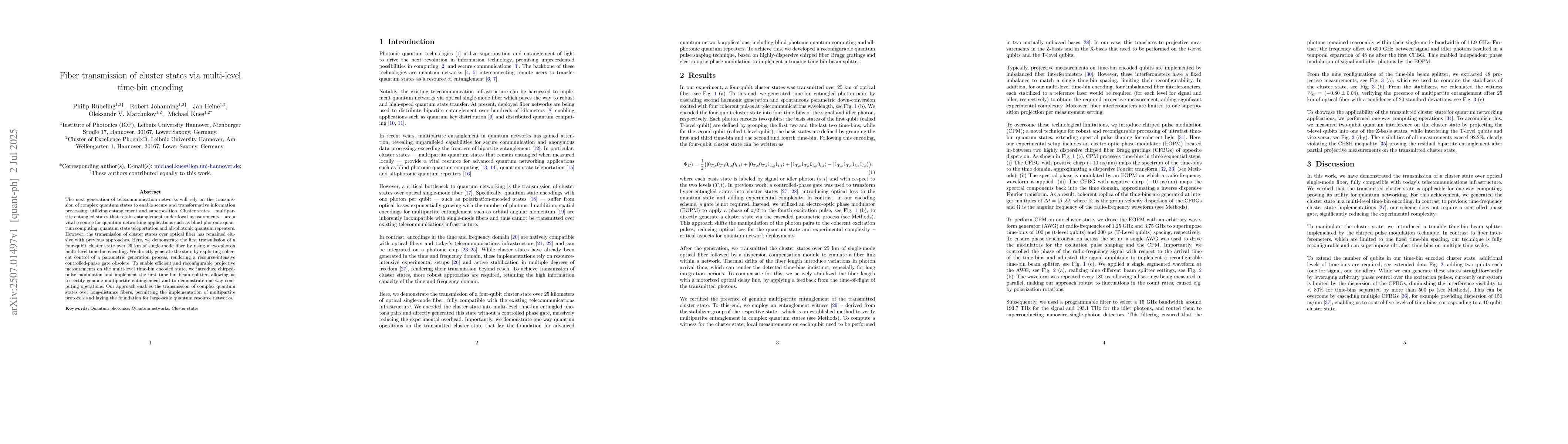 The next generation of telecommunication networks will rely on the transmission of complex quantum states to enable secure and transformative information processing, utilizing entanglement and superposition. Cluster states - multipartite entangled states that retain entanglement under local measurements - are a vital resource for quantum networking applications such as blind photonic quantum computing, quantum state teleportation and all-photonic quantum repeaters. However, the transmission of cluster states over optical fiber has remained elusive with previous approaches. Here, we demonstrate the first transmission of a four-qubit cluster state over 25 km of single-mode fiber by using a two-photon multi-level time-bin encoding. We directly generate the state by exploiting coherent control of a parametric generation process, rendering a resource-intensive controlled-phase gate obsolete. To enable efficient and reconfigurable projective measurements on the multi-level time-bin encoded state, we introduce chirped-pulse modulation and implement the first time-bin beam splitter, allowing us to certify genuine multipartite entanglement and to demonstrate one-way computing operations. Our approach enables the transmission of complex quantum states over long-distance fibers, permitting the implementation of multipartite protocols and laying the foundation for large-scale quantum resource networks.