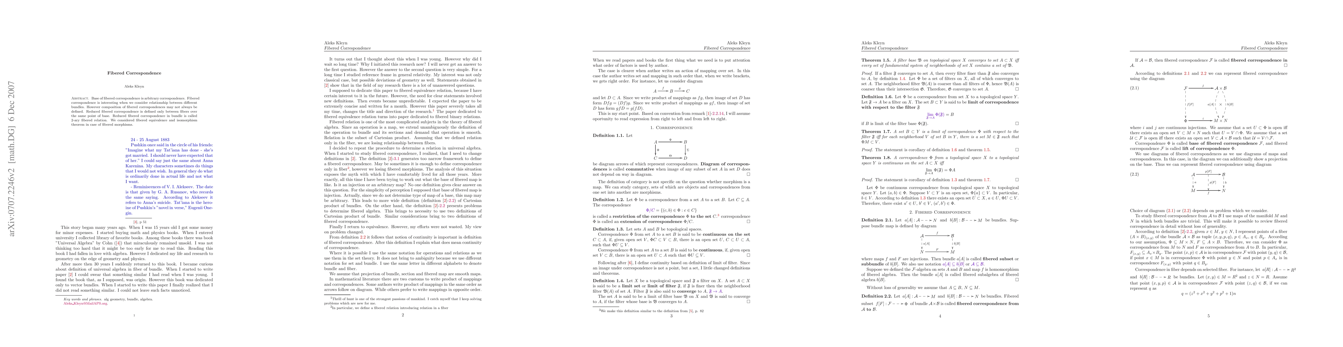 This paper explores fibered correspondences, focusing on relationships between different bundles. It discusses the limitations of composing fibered correspondences and introduces reduced fibered correspondences, specifically 2-ary fibered relations, and examines fibered equivalence and isomorphism in fibered morphisms.