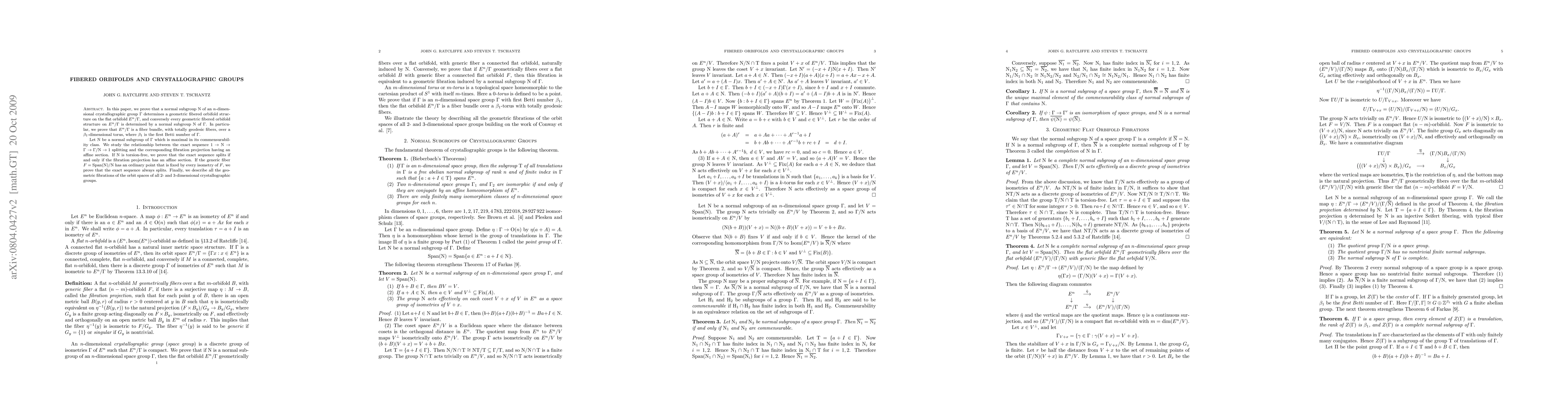 This paper establishes a correspondence between normal subgroups of n-dimensional crystallographic groups and geometric fibered orbifold structures on the flat orbifold E^n/G, proving that E^n/G is a fiber bundle over a b-dimensional torus. It also investigates conditions under which the exact sequence of a normal subgroup splits and analyzes geometric fibrations for 2- and 3-dimensional crystallographic groups.