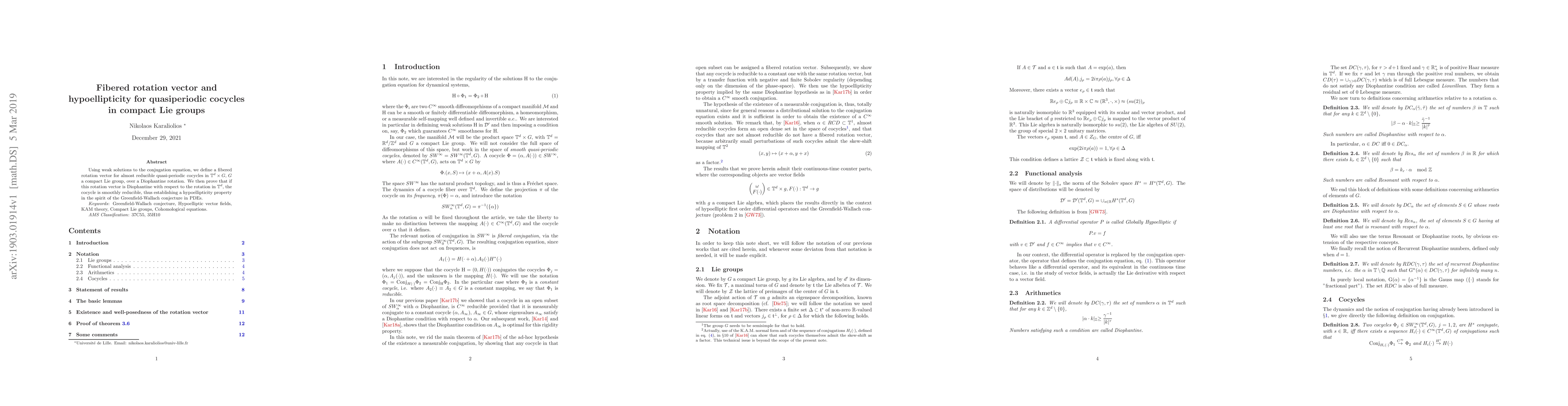 This paper defines a fibered rotation vector for quasiperiodic cocycles in compact Lie groups and proves that when this vector is Diophantine, the cocycle exhibits hypoellipticity, supporting the Greenfield-Wallach conjecture for PDEs.