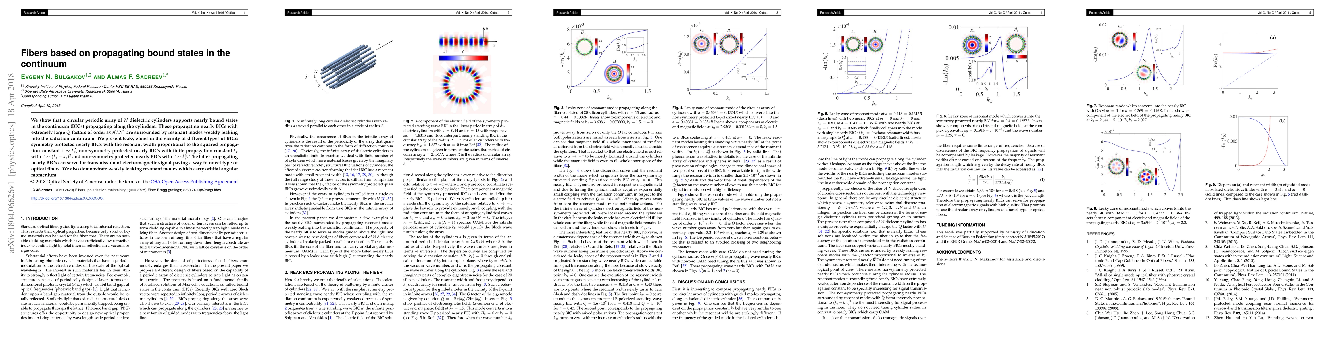 We show that a circular periodic array of $N$ dielectric cylinders supports nearly bound states in the continuum (BICs) propagating along the cylinders. These propagating nearly BICs with extremely large $Q$ factors of order $exp(\lambda N)$ are surrounded by resonant modes weakly leaking into the radiation continuum. We present leaky zones in the vicinity of different types of BICs: symmetry protected nearly BICs with the resonant width proportional to the squared propagation constant $\Gamma \sim k_z^2$, non-symmetry protected nearly BICs with finite propagation constant $k_c$ with $\Gamma\sim (k_z-k_c)^2$ and non-symmetry protected nearly BICs with $\Gamma\sim k_z^4$. The latter propagating nearly BICs can serve for transmission of electromagnetic signal paving a way to novel type of optical fibers. We also demonstrate weakly leaking resonant modes which carry orbital angular momentum.