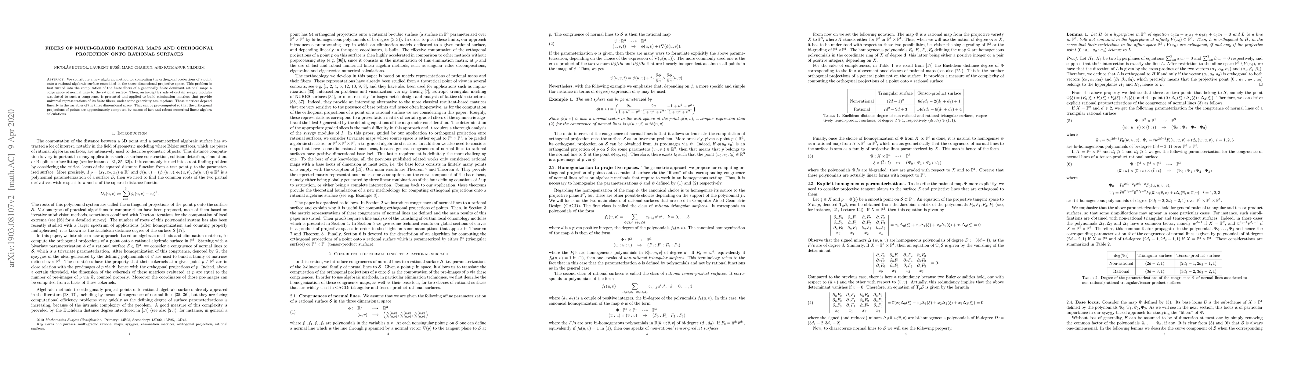 We contribute a new algebraic method for computing the orthogonal projections of a point onto a rational algebraic surface embedded in the three dimensional projective space. This problem is first turned into the computation of the finite fibers of a generically finite dominant rational map: a congruence of normal lines to the rational surface. Then, an in-depth study of certain syzygy modules associated to such a congruence is presented and applied to build elimination matrices that provide universal representations of its finite fibers, under some genericity assumptions. These matrices depend linearly in the variables of the three dimensional space. They can be pre-computed so that the orthogonal projections of points are approximately computed by means of fast and robust numerical linear algebra calculations.
