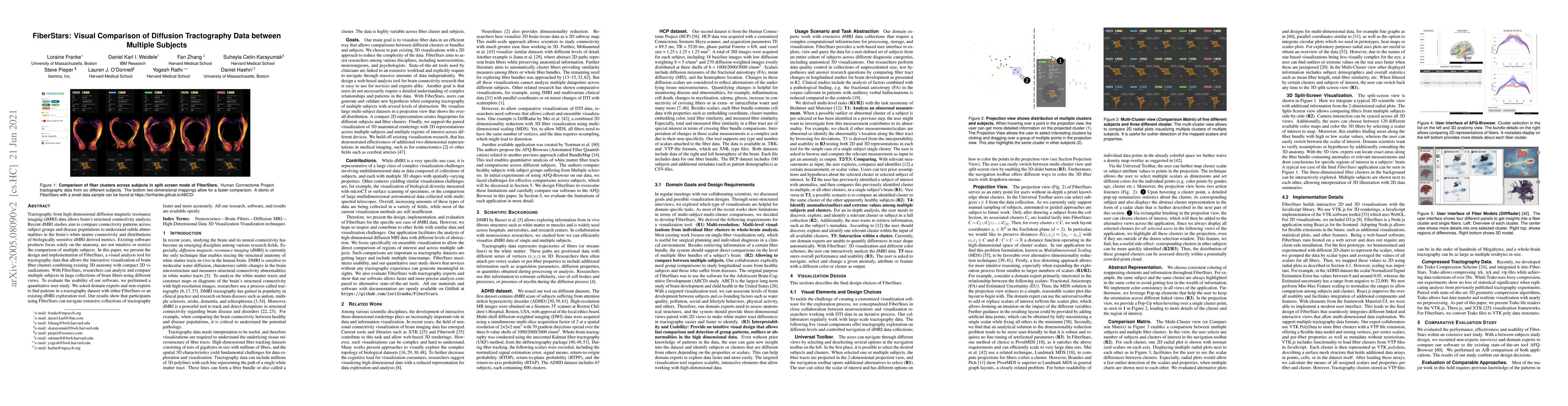 Tractography from high-dimensional diffusion magnetic resonance imaging (dMRI) data allows brain's structural connectivity analysis. Recent dMRI studies aim to compare connectivity patterns across subject groups and disease populations to understand subtle abnormalities in the brain's white matter connectivity and distributions of biologically sensitive dMRI derived metrics. Existing software products focus solely on the anatomy, are not intuitive or restrict the comparison of multiple subjects. In this paper, we present the design and implementation of FiberStars, a visual analysis tool for tractography data that allows the interactive visualization of brain fiber clusters combining existing 3D anatomy with compact 2D visualizations. With FiberStars, researchers can analyze and compare multiple subjects in large collections of brain fibers using different views. To evaluate the usability of our software, we performed a quantitative user study. We asked domain experts and non-experts to find patterns in a tractography dataset with either FiberStars or an existing dMRI exploration tool. Our results show that participants using FiberStars can navigate extensive collections of tractography faster and more accurately. All our research, software, and results are available openly.