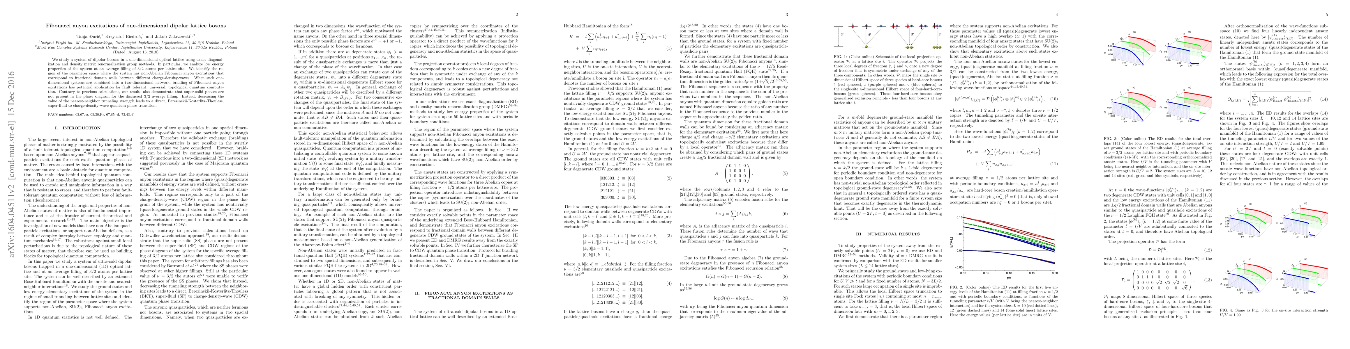 We study a system of dipolar bosons in a one-dimensional optical lattice using exact diagonalization and density matrix renormalization group methods. In particular, we analyze low energy properties of the system at an average filling of 3/2 atoms per lattice site. We identify the region of the parameter space where the system has non-Abelian Fibonacci anyon excitations that correspond to fractional domain walls between different charge-density-waves. When such one-dimensional systems are combined into a two-dimensional network, braiding of Fibonacci anyon excitations has potential application for fault tolerant, universal, topological quantum computation. Contrary to previous calculations, our results also demonstrate that super-solid phases are not present in the phase diagram for the discussed 3/2 average filling. Instead, decreasing the value of the nearest-neighbor tunneling strength leads to a direct, Berezinskii-Kosterlitz-Thouless, super-fluid to charge-density-wave quantum phase transition.