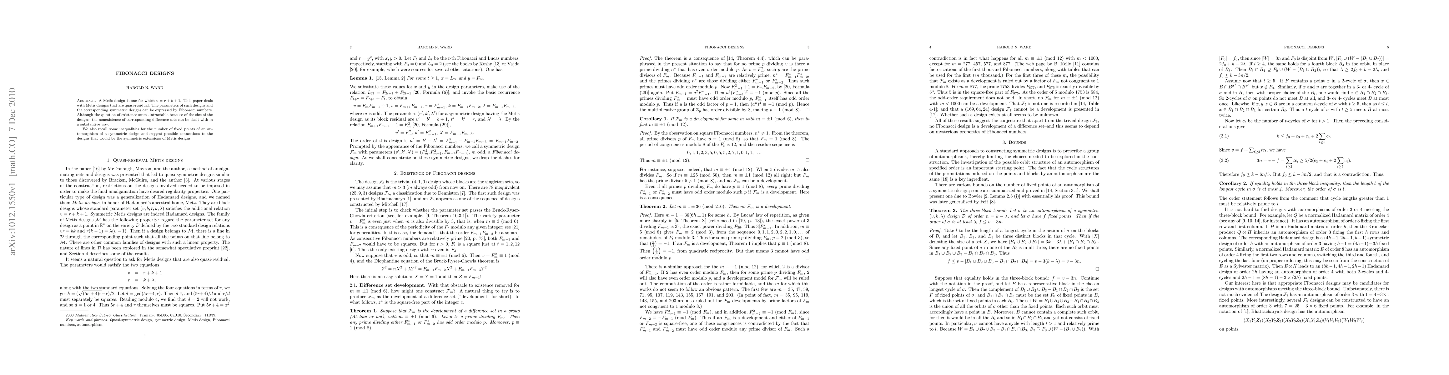 A Metis design is one for which v=r+k+1. This paper deals with Metis designs that are quasi-residual. The parameters of such designs and the corresponding symmetric designs can be expressed by Fibonacci numbers. Although the question of existence seems intractable because of the size of the designs, the nonexistence of corresponding difference sets can be dealt with in a substantive way. We also recall some inequalities for the number of fixed points of an automorphism of a symmetric design and suggest possible connections to the designs that would be the symmetric extensions of Metis designs.