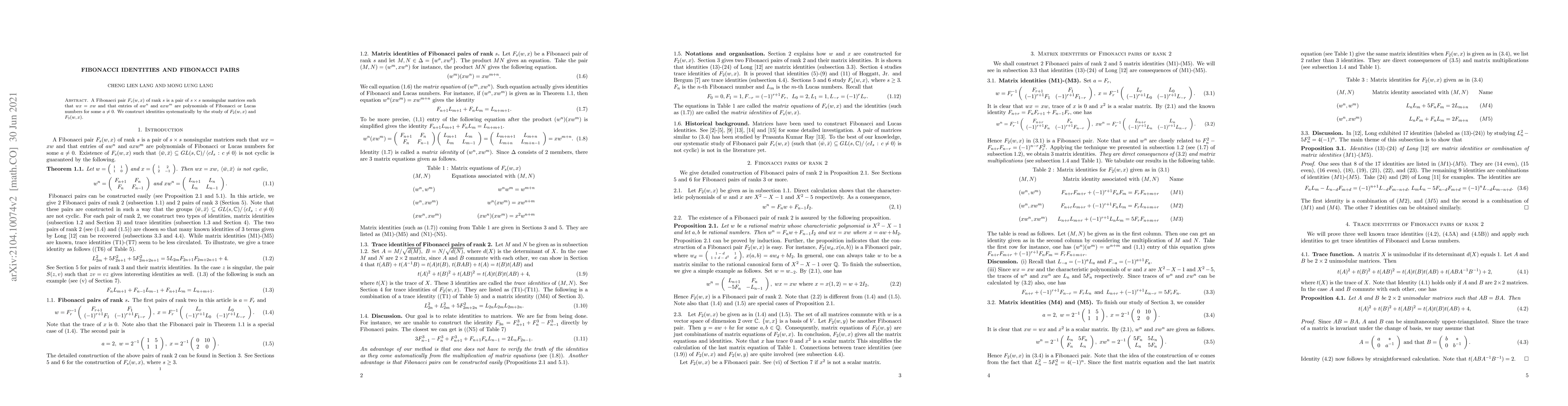 This paper explores Fibonacci pairs, defined as nonsingular matrices whose entries relate to Fibonacci or Lucas numbers, and constructs systematic identities through the study of $F_2(w, x)$ and $F_3(w, x)$. The focus is on the algebraic properties and identities of these matrices.