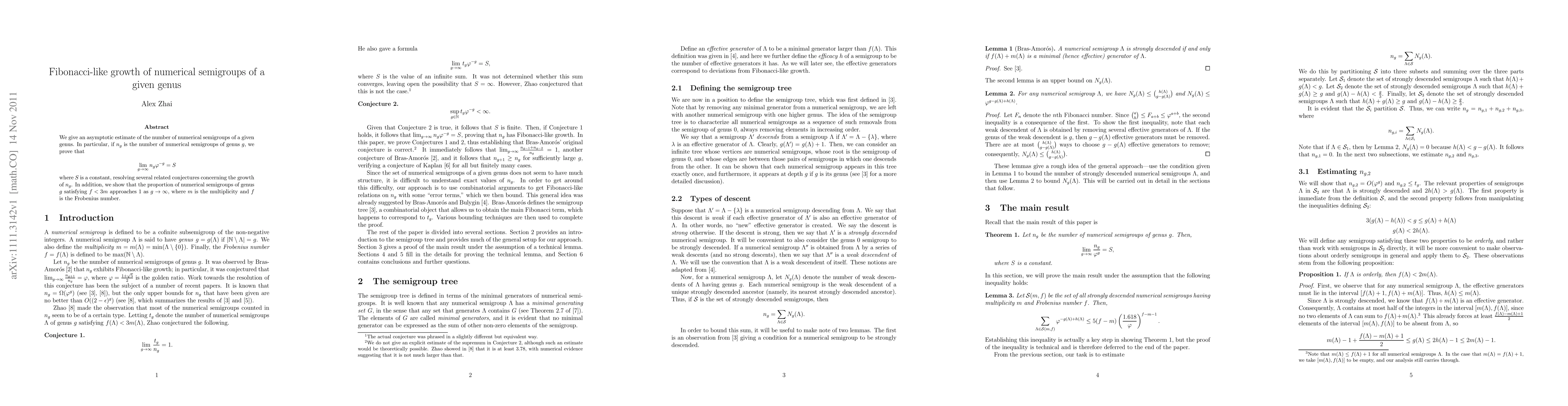 This paper provides an asymptotic estimate for the number of numerical semigroups of a given genus, showing that it grows in a Fibonacci-like manner, tending to $S \phi^g$ as genus $g$ increases, where $\phi$ is the golden ratio. It also demonstrates that the proportion of semigroups with $f < 3m$ approaches 1 as $g$ grows large.
