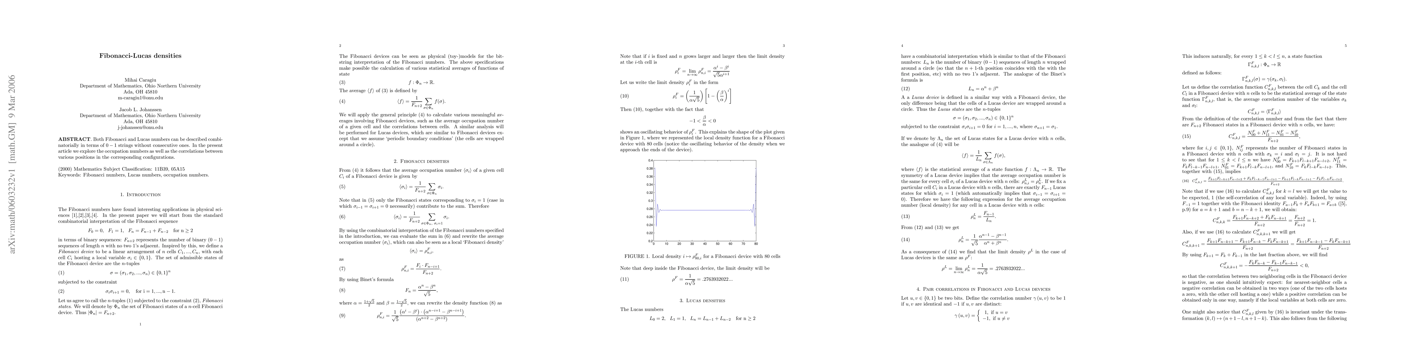Both Fibonacci and Lucas numbers can be described combinatorially in terms of 0-1 strings without consecutive ones. In the present article we explore the occupation numbers as well as the correlations between various positions in the corresponding configurations.