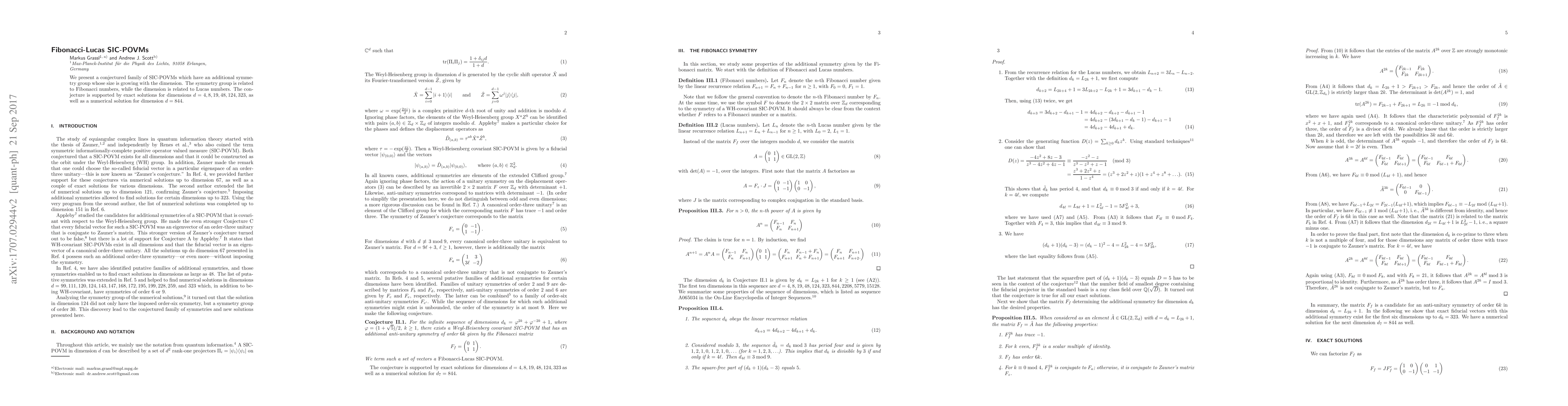 This paper proposes a conjectured family of SIC-POVMs with a symmetry group linked to Fibonacci numbers and dimensions related to Lucas numbers. The conjecture is validated through exact solutions for specific dimensions and a numerical solution for a larger dimension.